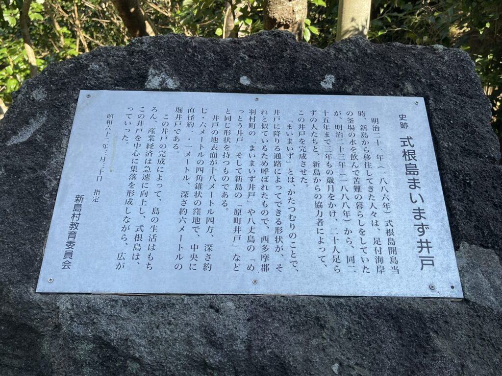 式根島まいまいず井戸は、1890(明治23)年から、3年の月日をかけて、20人足らずの島民と新島の協力者で完成させた悲願の掘井戸で、水不足に悩み続けた島民の生活、経済、産業を急速に向上させました。地下水位の深さから、らせん状に通路を作って掘り下げた原始的な井戸を、その形状より、「かたつむり=まいまい」になぞらえて、まいまいず井戸と呼び、同形状の井戸は東京都武蔵野台地や伊豆諸島に点在しています。この井戸がメインの時代、村の女衆は頭におけを乗せて、井戸と家の水がめを毎日何十回も往復して、水汲みをする重労働をこなしていました。