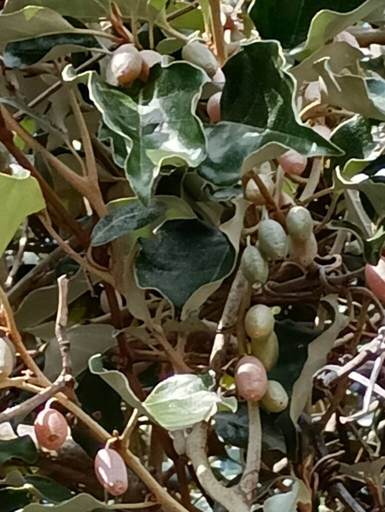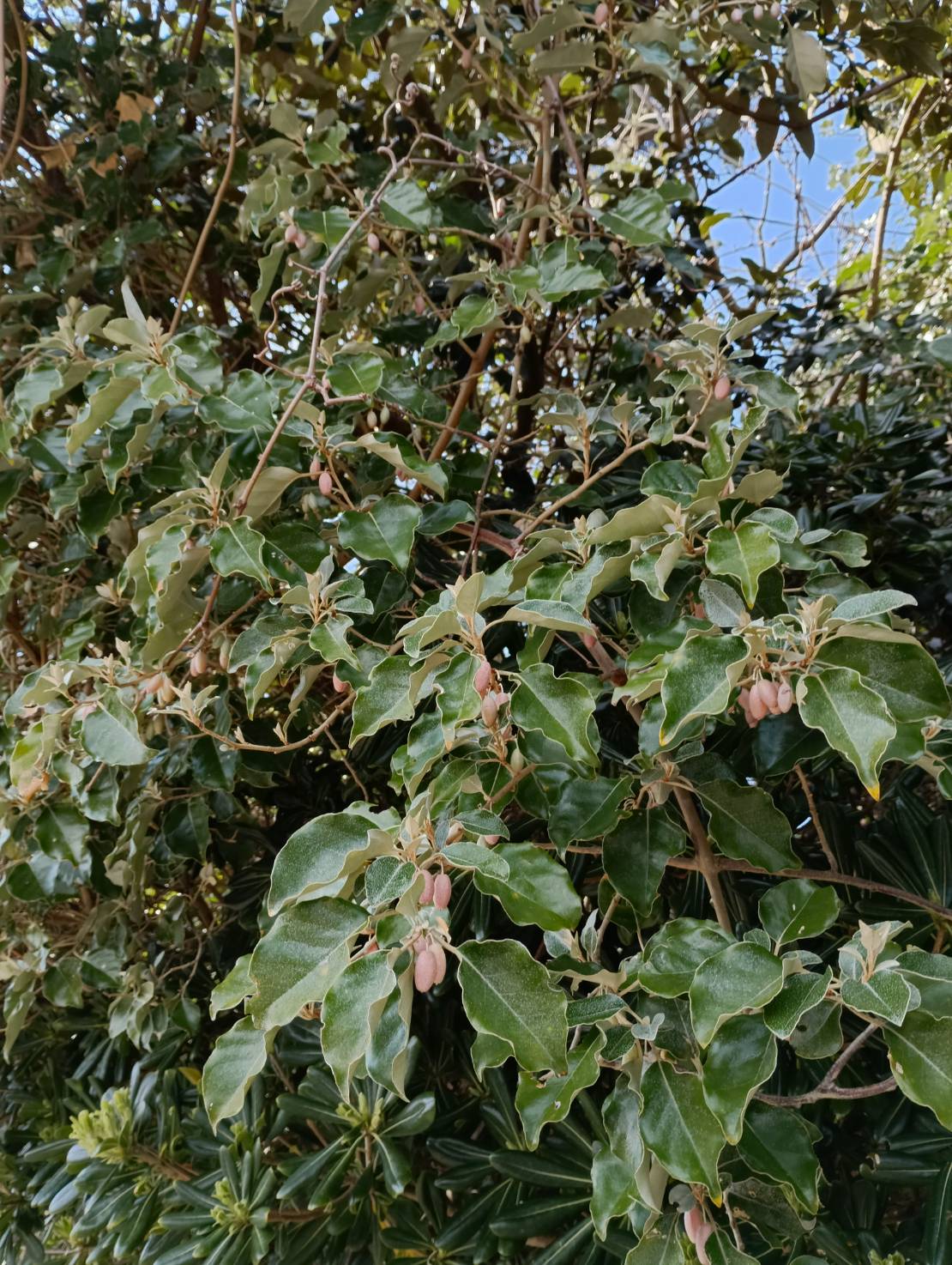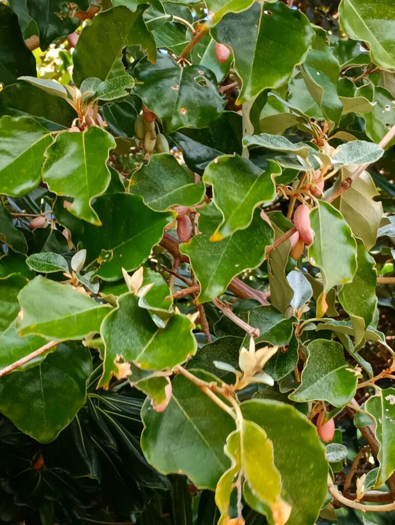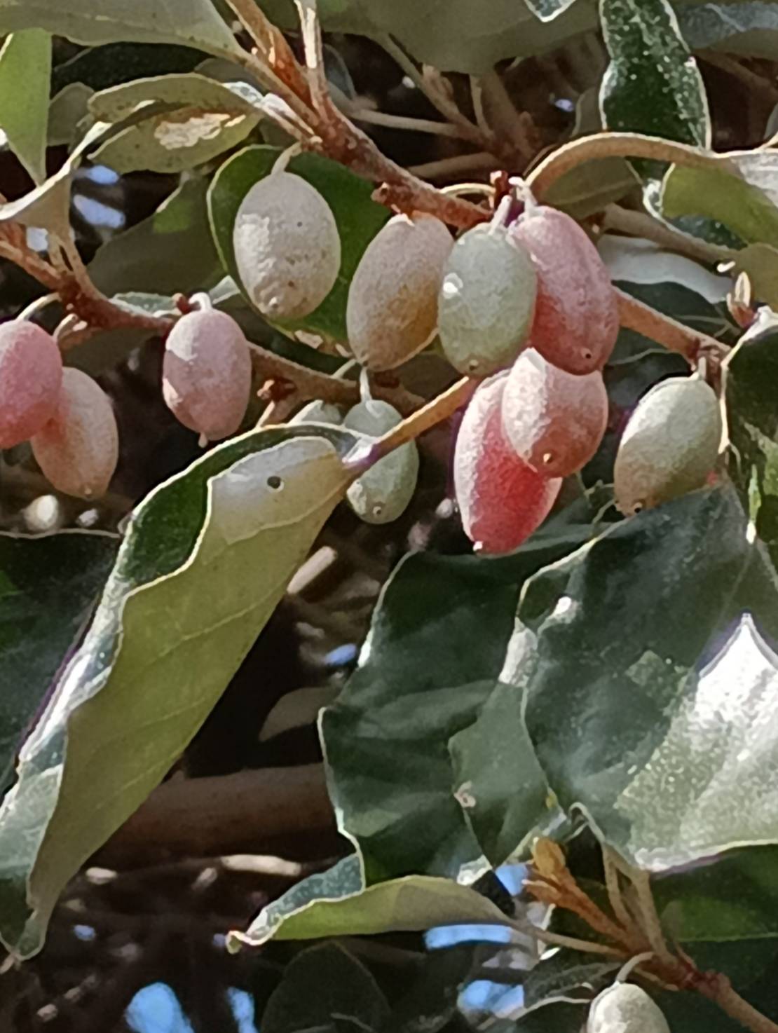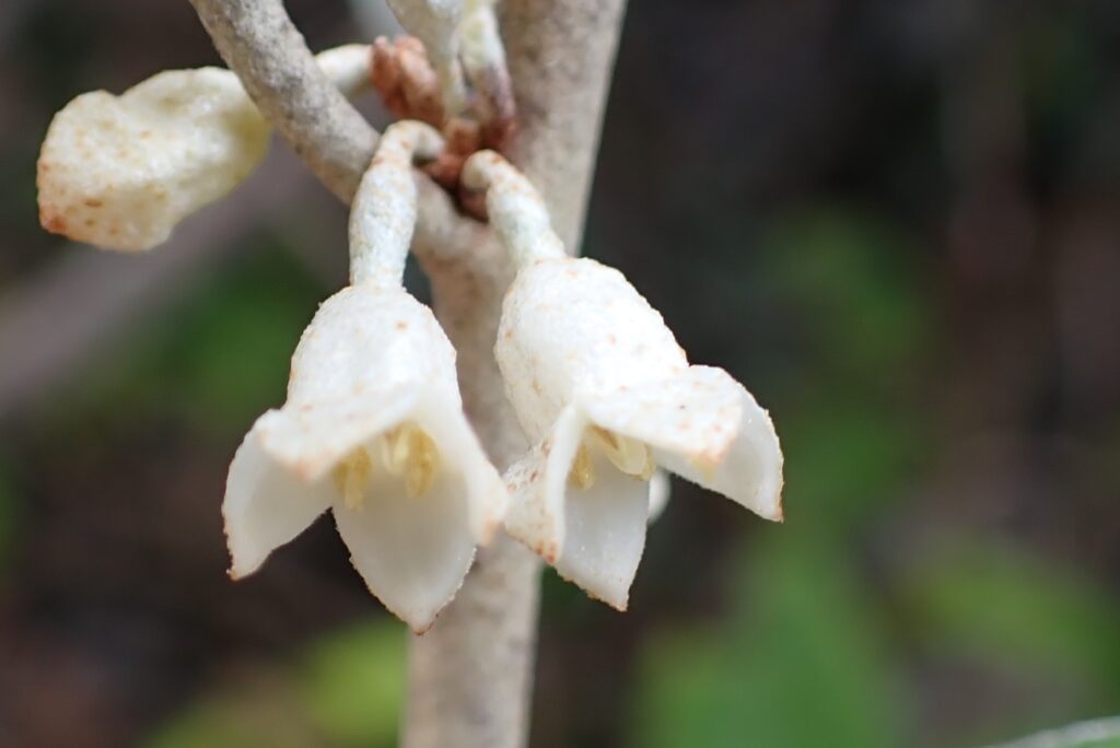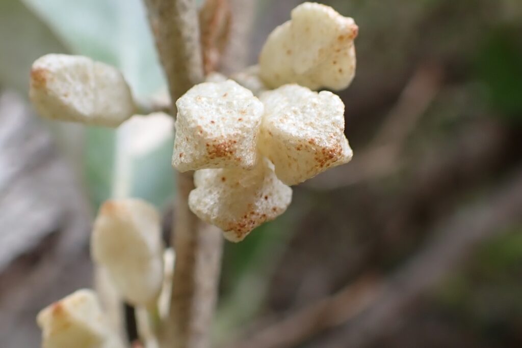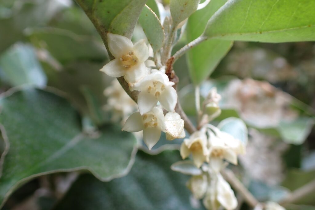 海岸付近に自生する常緑のつる性低木。潮風や乾燥に非常に強く、式根島の海岸沿いや林縁でよく見られます。葉は厚い革質で、表面は光沢のある緑色ですが、裏面は銀白色の鱗片(りんぺん)に覆われており目立ちます。多くのグミが初夏に実を付けるのに対し、マルバグミは秋(10〜11月頃)に芳香のある白い花を咲かせ、翌春に大きな楕円形の実がなります。この実は食用となり、昔の島の子どもたちにとっては身近な「春のおやつ」でした。