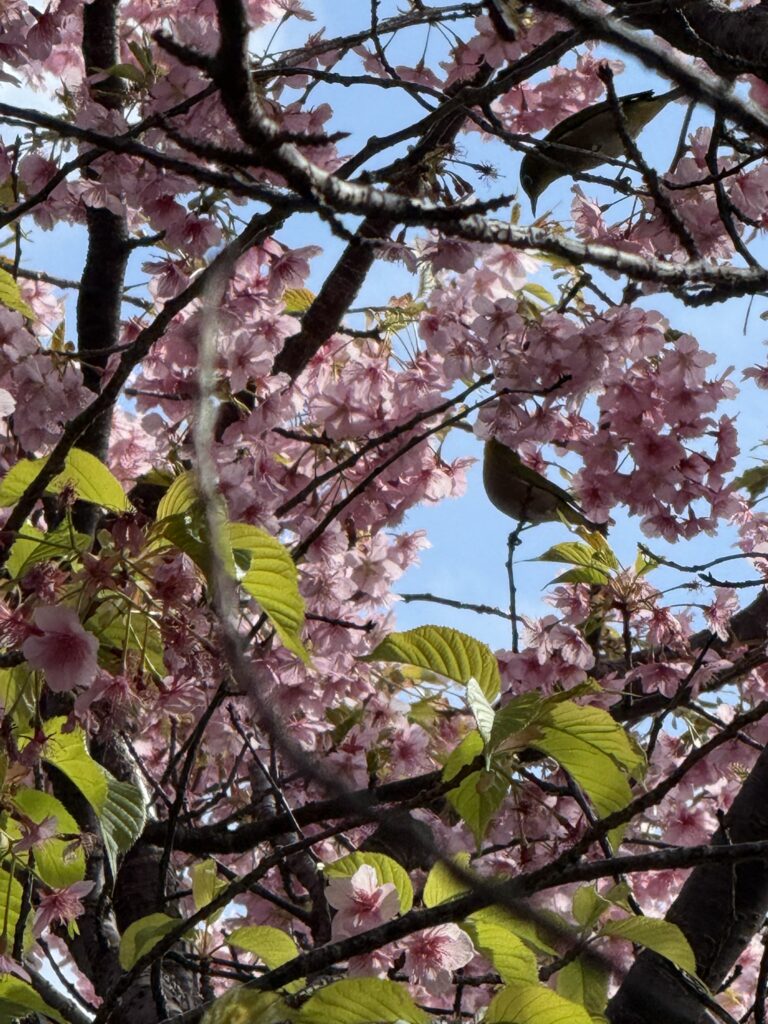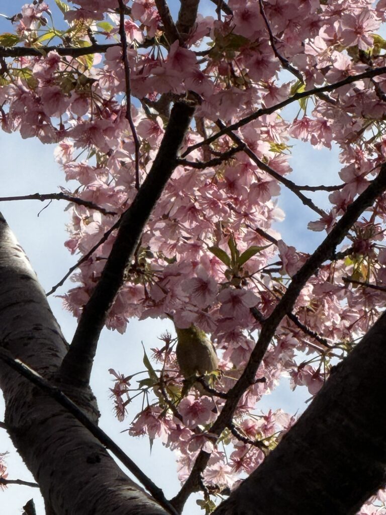 穏やかなある日。新島村の鳥「シチトウメジロ」の群れが、河津桜の枝から枝に飛び交い、忙しなく蜜を吸う姿が見えました。式根島の早春の風物詩です。
