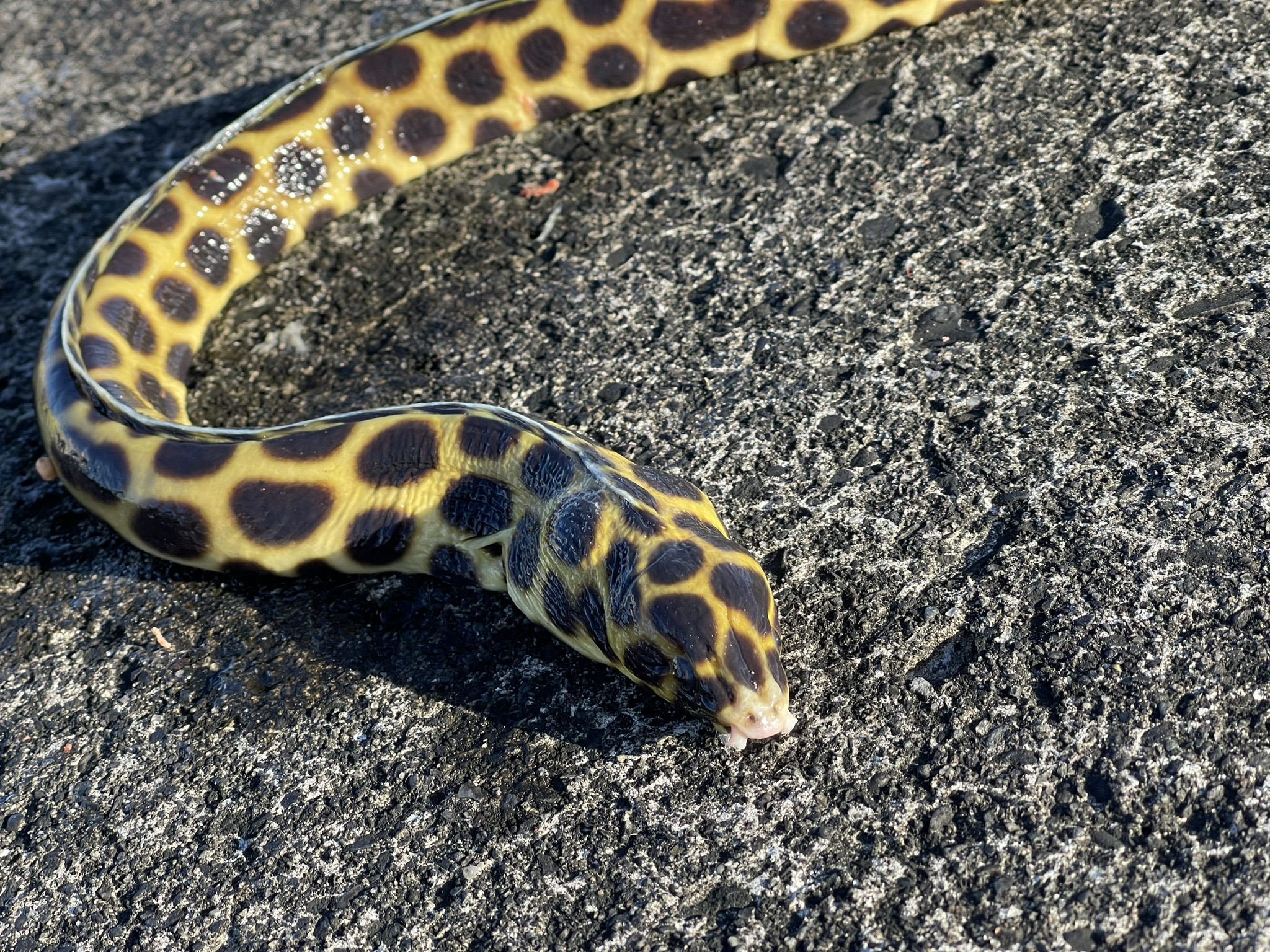 ウミヘビは爬虫類と魚類(ウナギの仲間)の2種類いて、危険なのは爬虫類の方で、主に琉球諸島に生息。式根島で見かけるウミヘビはヒレがある魚類の方なので、ご安心を。特によく見かけるのは、このキリンのような柄のモヨウモンガラドオシ。よく見るとかわいい顔で歯も鋭くない。観賞用に飼う人もいる。毒もない。