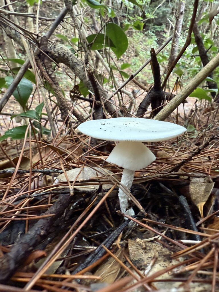 息を吹きかければ倒れてしまう、繊細な美しいきのこ「キツネノハナガサ」です。式根島には狐はおりません。