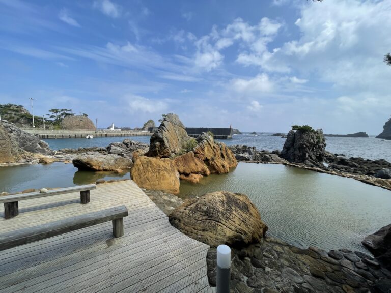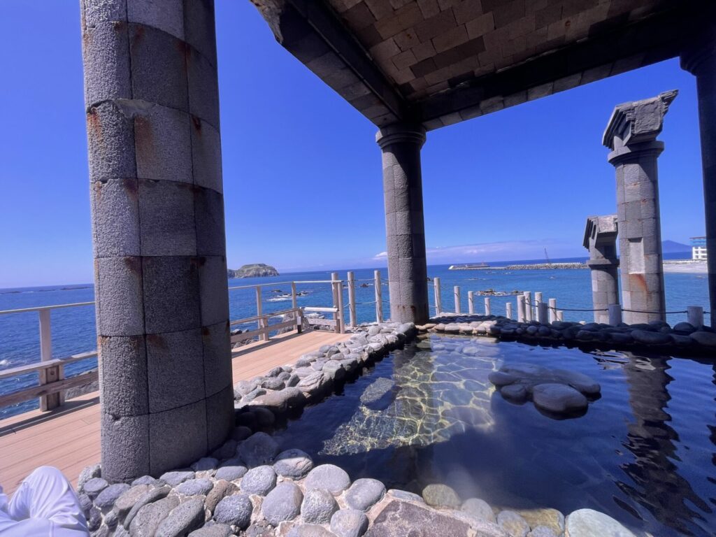 間々下海岸に隣接する無料の「湯の浜露天温泉」は水着着用で入浴。大海原が眼下に広がる。更衣室とシャワーが便利。