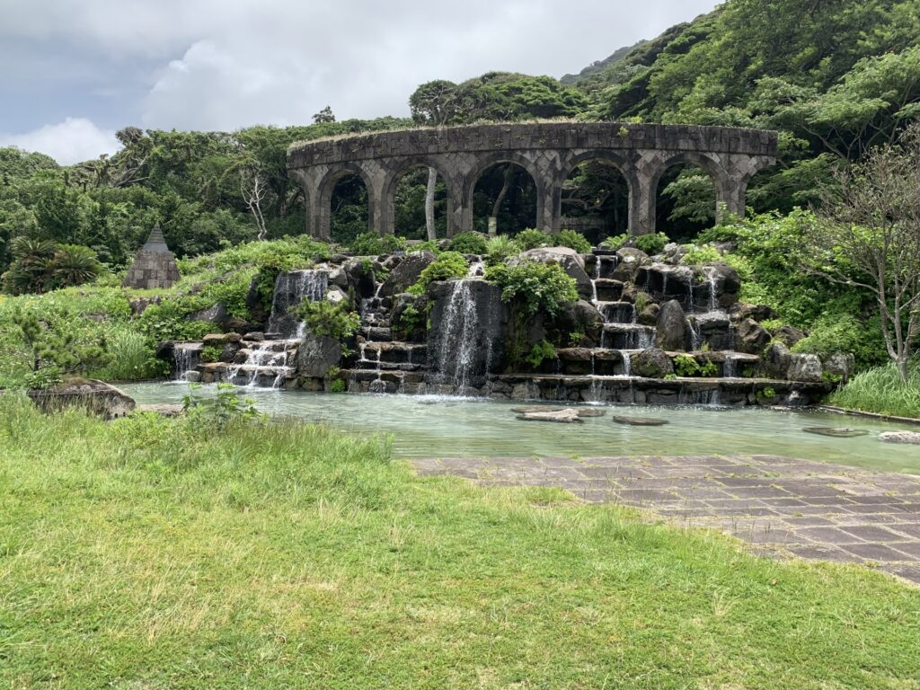 石と水がテーマの公園。特産のコーガ石で作った遺跡風のモニュメント前で映え写真を撮ろう!パスタなどの洋食からドリンクまで充実メニューのレストハウスも併設しています。
