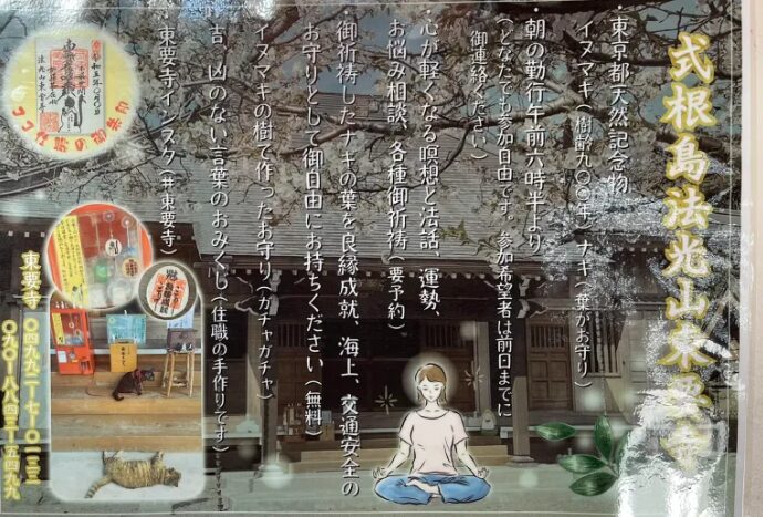 式根島唯一の寺院が法光山 東要寺は、前日に電話で予約(TEL:04992-7-0133)すれば、朝の勤行に誰でも参加できます。 東要寺には、樹齢900年、高さ30m、幹周5mのイヌマキの巨木や梛(ナギ)の木の自生地があり、いずれも東京都の天然記念物に指定されています。”サーファー和尚”自ら温かく迎えてくれるので、気軽に立ち寄ってみましょう。