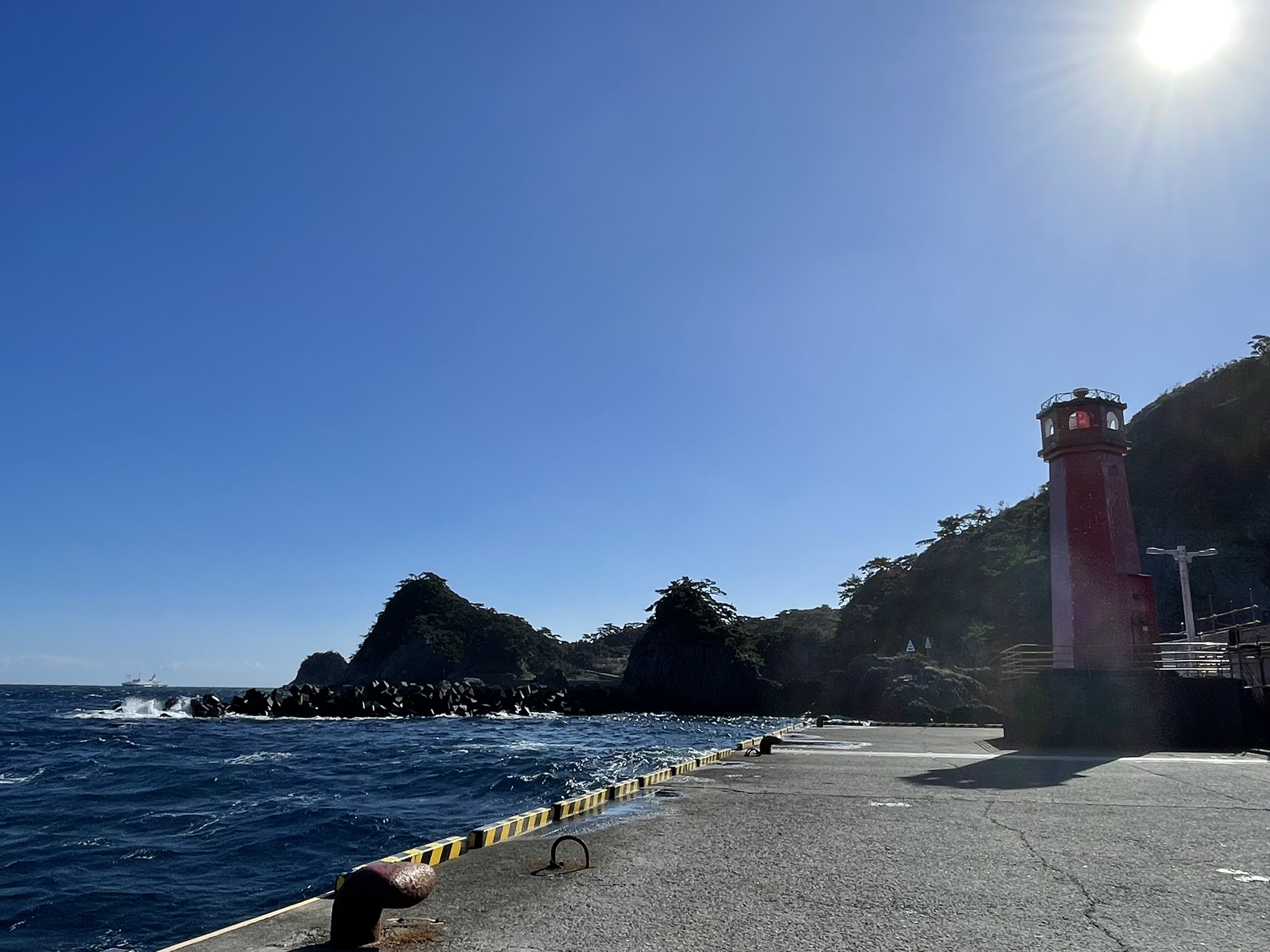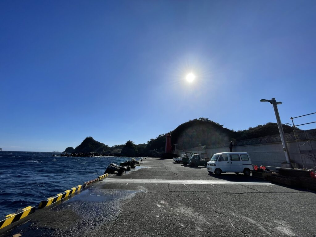 さるびあ丸・ジェット船、新島との連絡船が着く式根島の玄関口・野伏港(のぶしこう)は、新島と向かい合い、その間の潮通しが良く、大型青物から根魚まで魚種多彩に釣れる式根島を代表する釣りポイントとしても有名。釣りをする場合は、着岸や港湾作業の邪魔にならないよう配慮しよう。