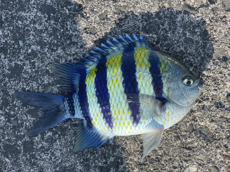 式根島の桟橋に群れている20㎝弱のスズメダイの仲間の1つ。幅の広い5本の横帯と黄色っぽい体表が目印の熱帯魚である。食用としては無名で持ち帰る人も少ないが、丸みを帯びた厚い体形で、意外と食べると美味しい。サビキ釣りでよく子どもが釣りあげている。