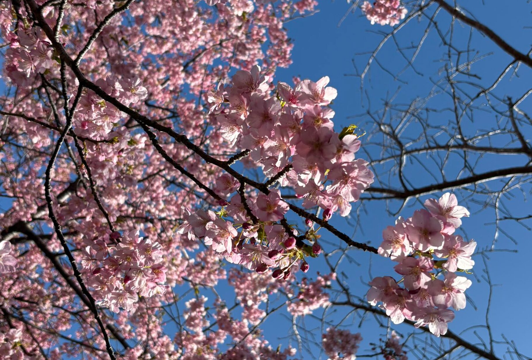 まだまだ風も強く海も荒れる早春の式根島。そんな厳しい毎日を送る島民の心を温かくするのが、青空に冴えるピンクの河津桜。島内の各所に点在し、小の口公園などで鑑賞できます。本数はさほどではありませんが、式根の春の風物詩を、一緒に愛でていただければと思います。河津桜は、ソメイヨシノと違って花期が長く、約1ヶ月咲き続けます。1月中旬過ぎから咲きはじめ、ピークは2月初旬~3月上旬。長く見頃が楽しめます。