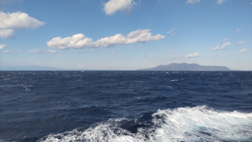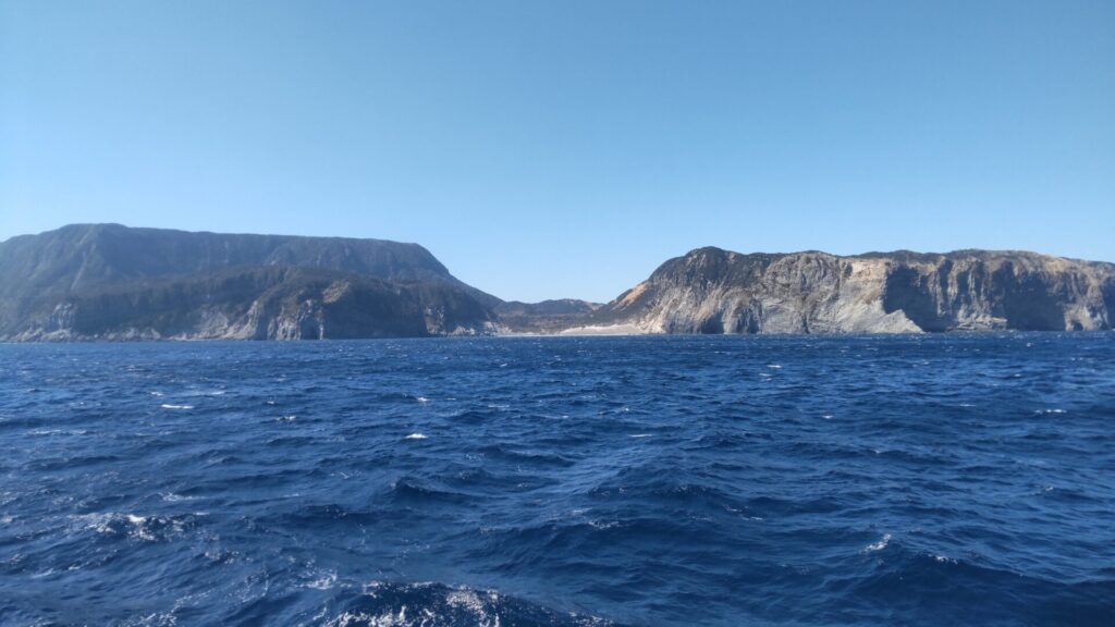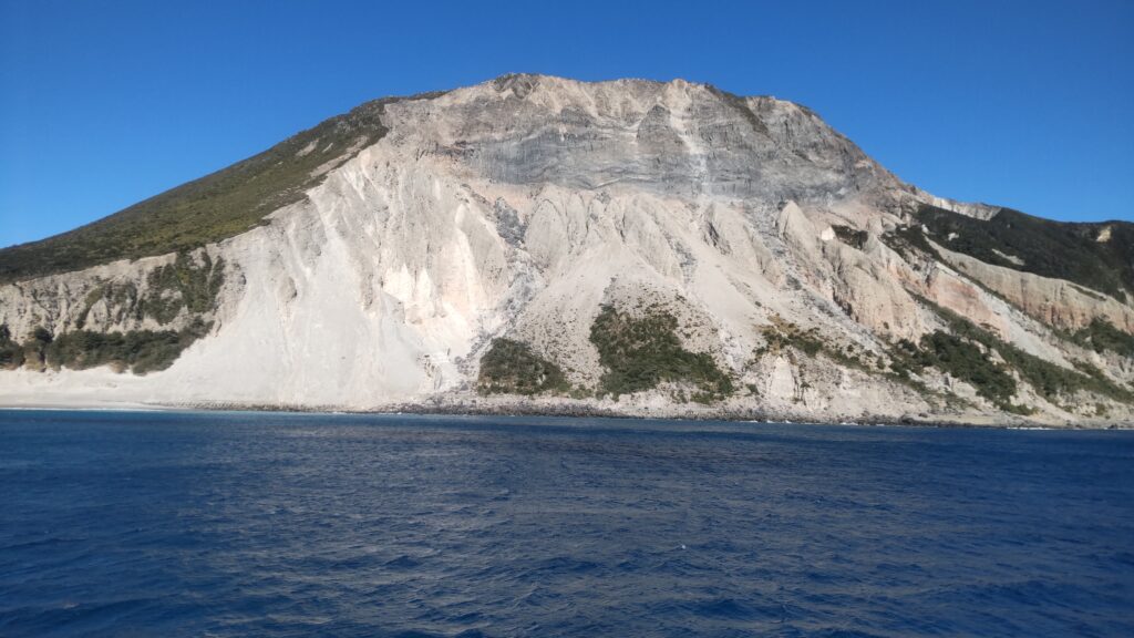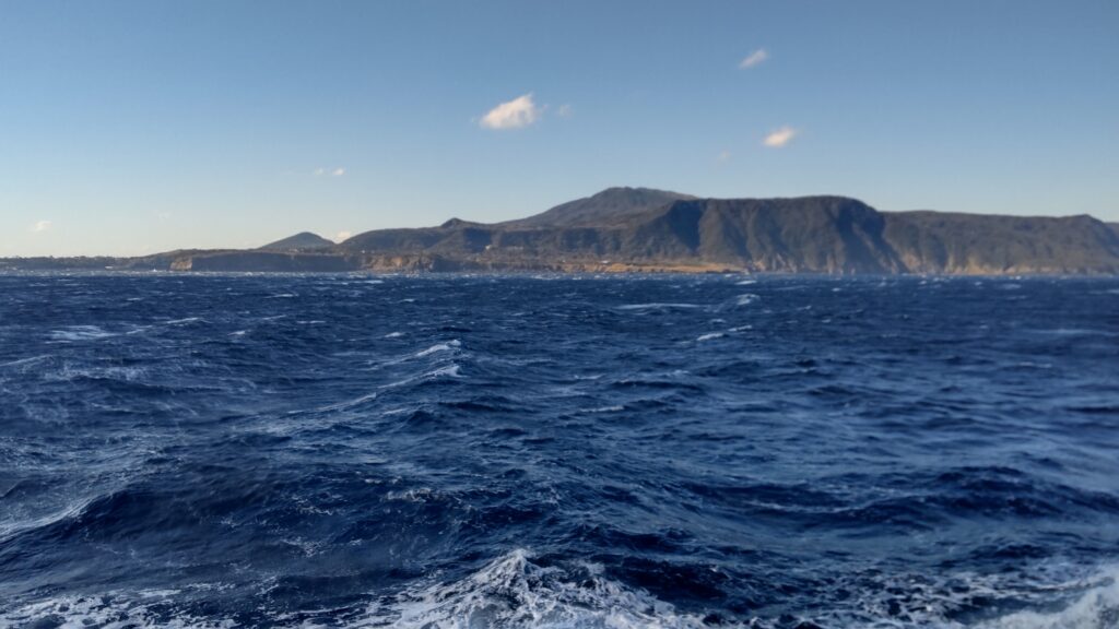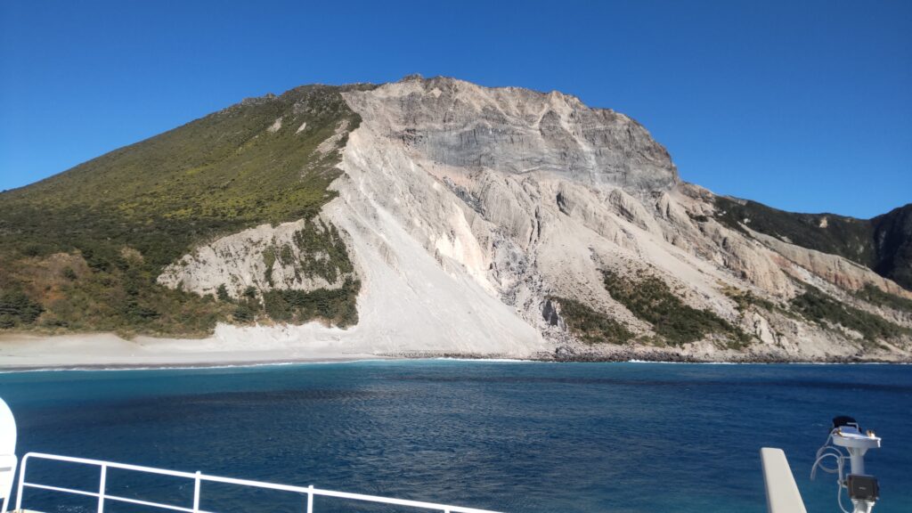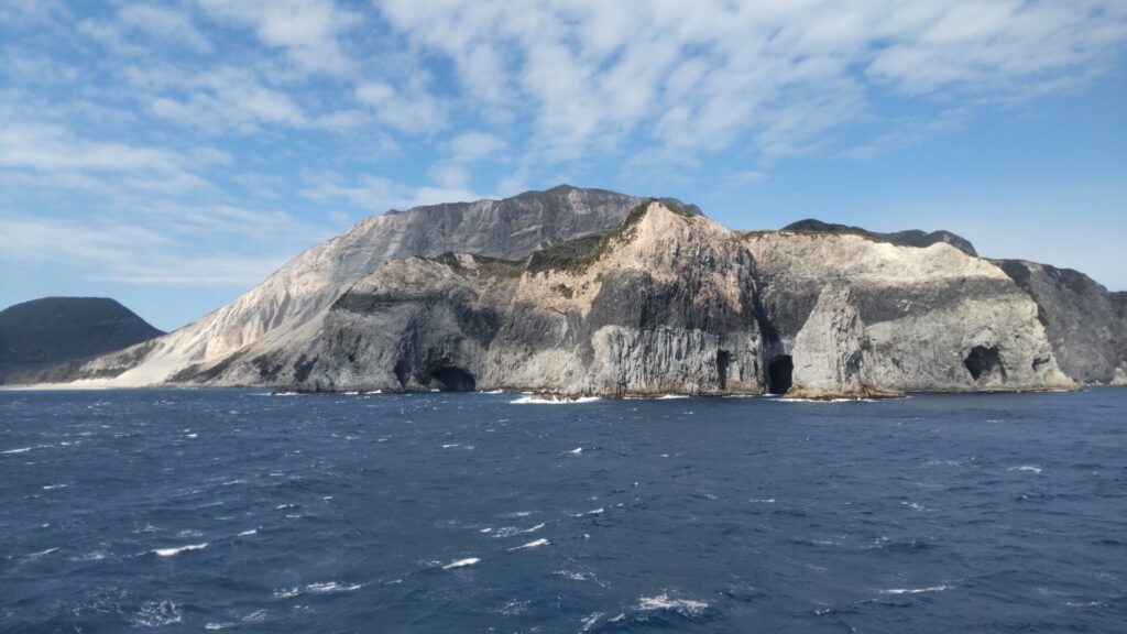 さて、多幸湾は神津島で天候が悪ければ、上り便が就航する日でも利用されるのだが、ここからが朝便のみの本番。先述の通り、式根島、新島、利島は寄らず、大島へ直行するのだから、通常の航路を辿る必要はない。西風が強いなら、島の東側を通るのが妥当であろう。すると、知ってる島なのに見慣れない景色が次々と現れる。
