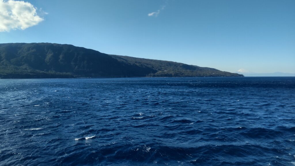 一度隠れた富士が大島の北端から見えると、もうすぐ岡田港。そこから先は通常航路となり、朝便のみの景色はそこで終了する。
