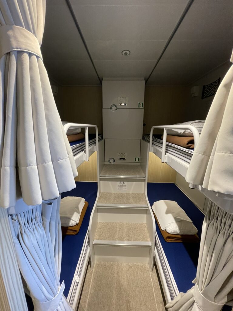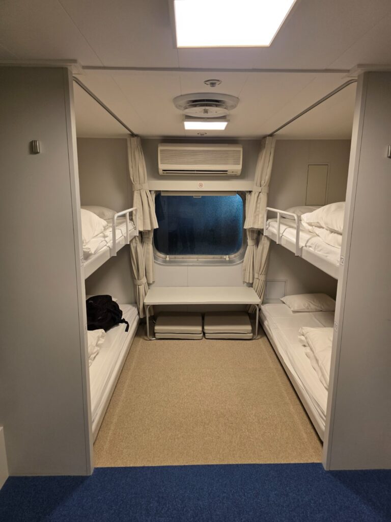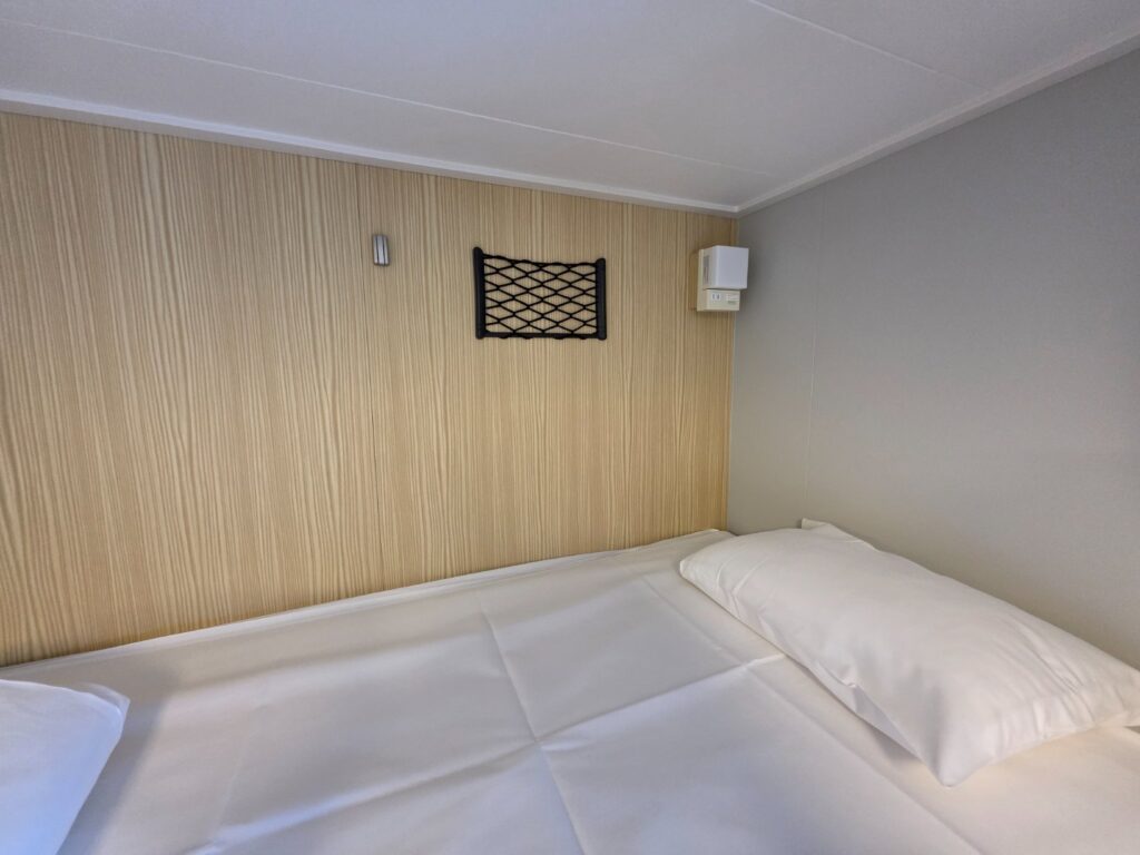 6室ある特1等は、シャワー・トイレ付きの二段ベッドルーム。ベッドは4つあり、4人で利用すれば貸し切り個室となる。湯沸かしケトルや冷蔵庫、机、浴衣、アメニティなどがつき、ベッドとベッドの間はテーブルでおかれ、和室スタイルでくつろげます。