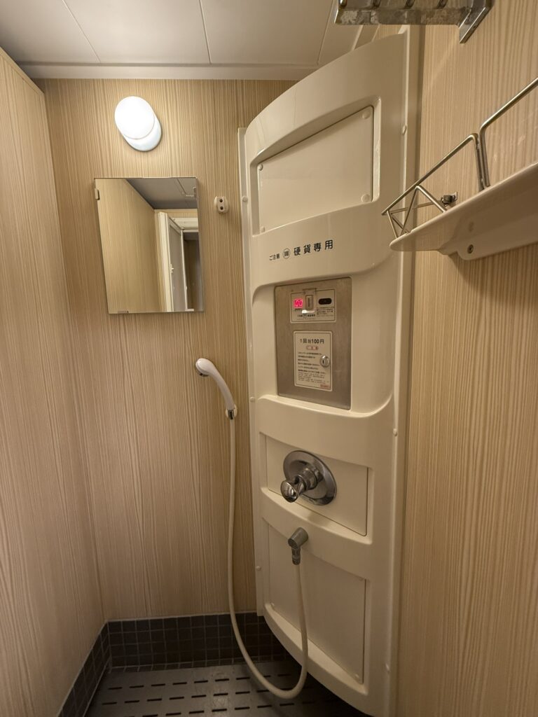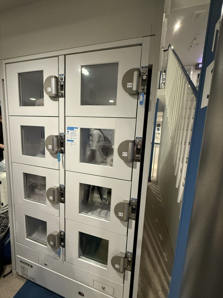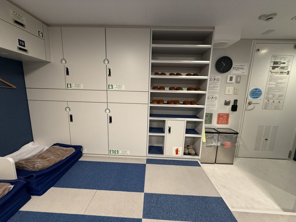 一番安く席数が多い2等和室。頭部の仕切りでプライバシーに配慮。共用のテレビとコンセント、各席に返金式ロッカーと荷物フックが付属。毛布は1枚200円でレンタルできる。ほとんどの人が借りており、上下1枚ずつ2枚借りる人も多い。