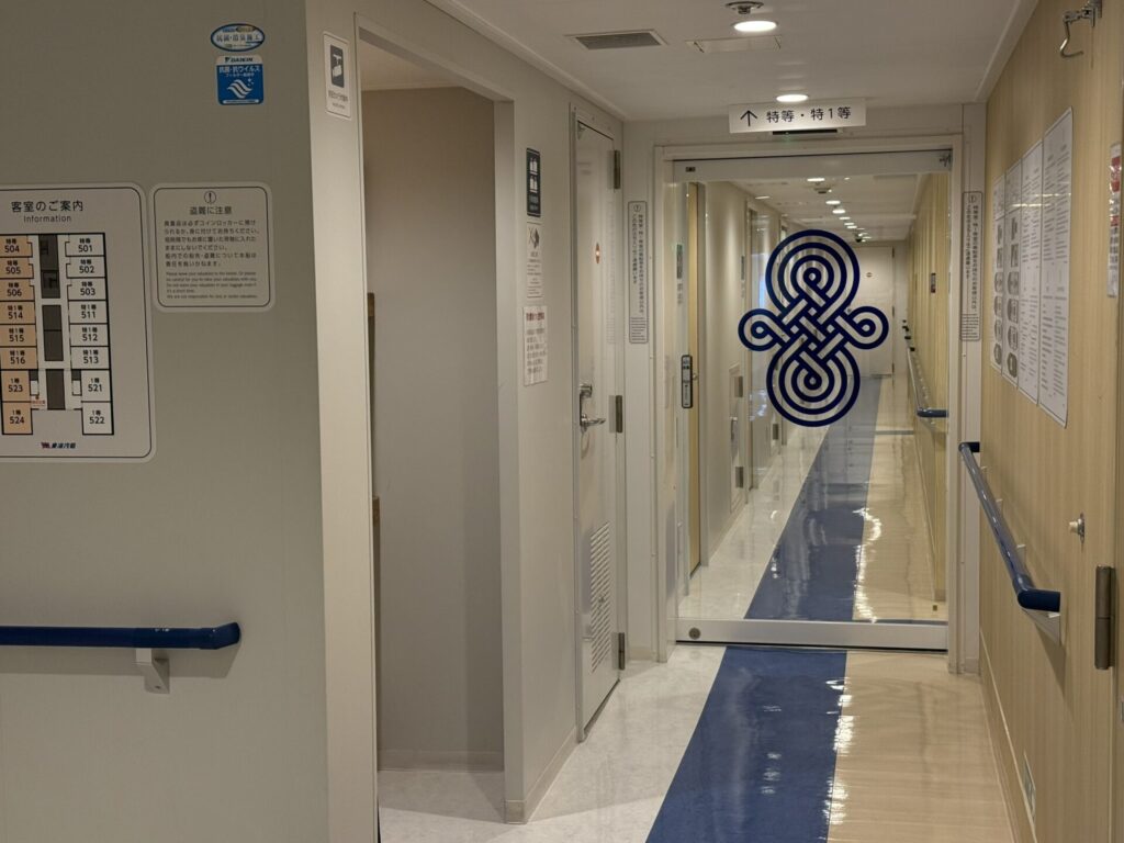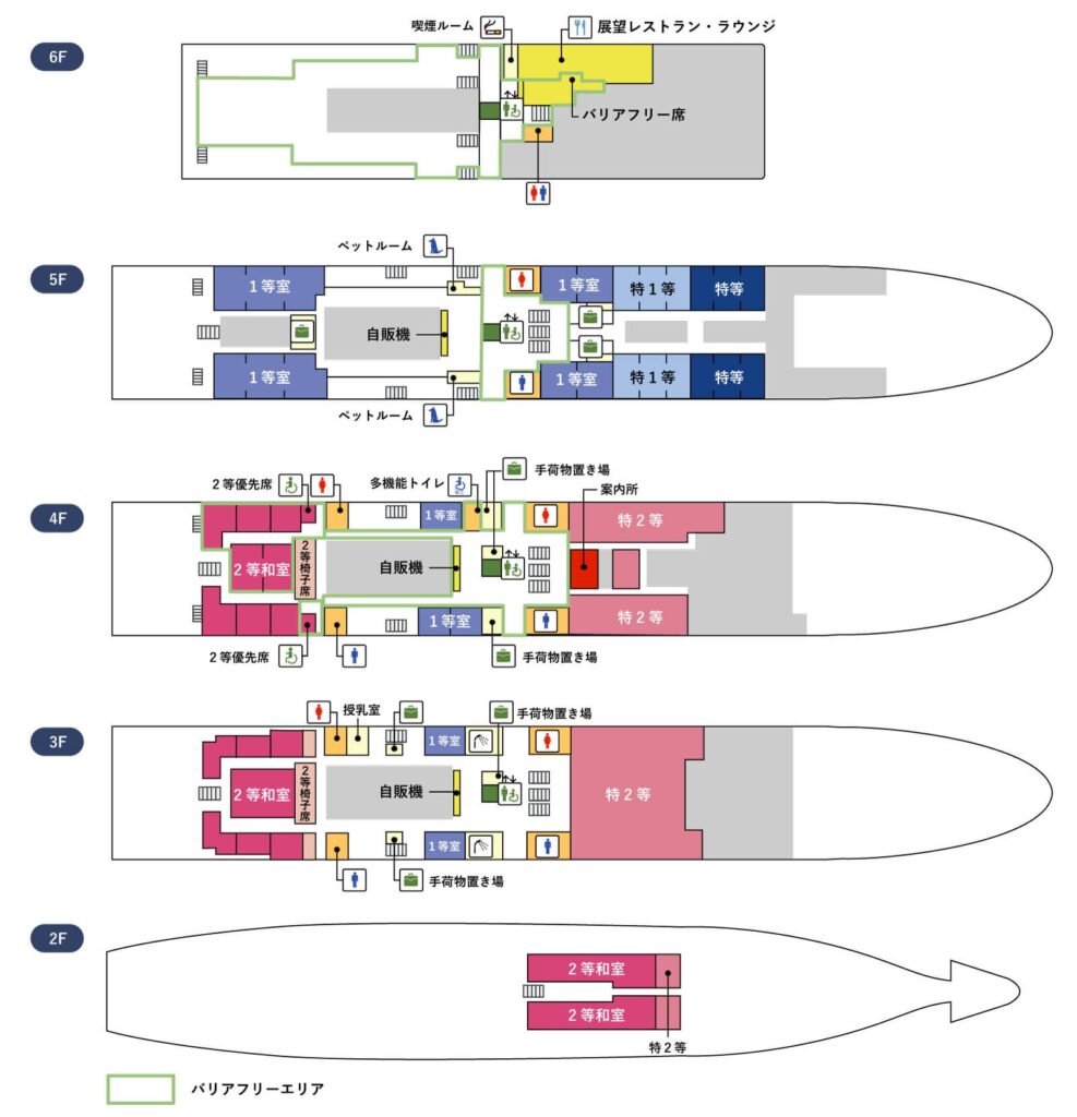 さるびあ丸は1甲板から6甲板の6F建てで、そのうち客室は2F~5Fで展開しています。
