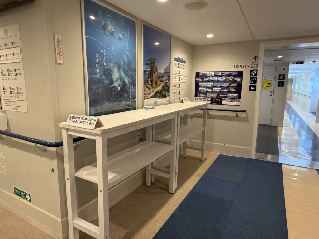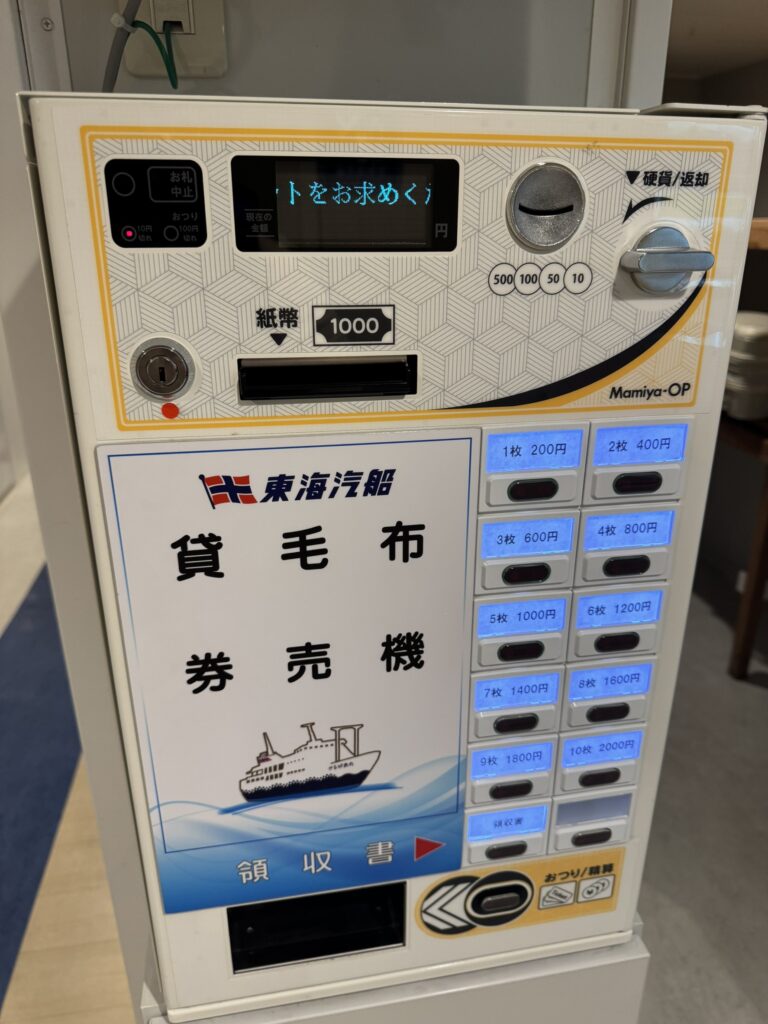 ・ソフトドリンク ・アルコール類(要・免許証) ・カップラーメン(熱湯付) ・貸毛布券売機 ・東海汽船グッズ ・氷 など