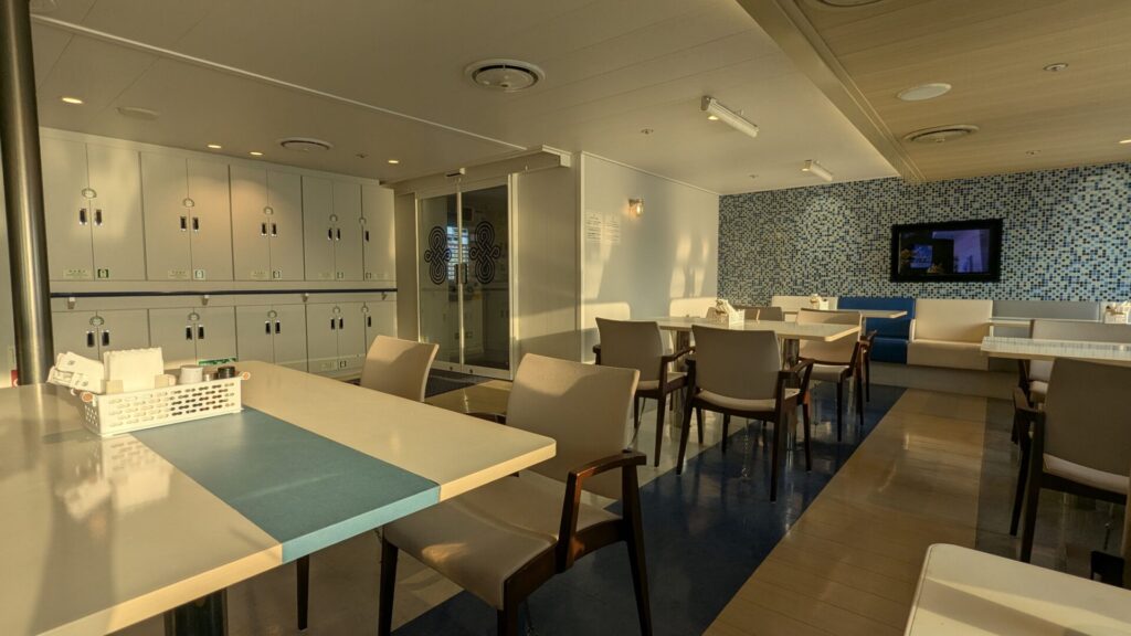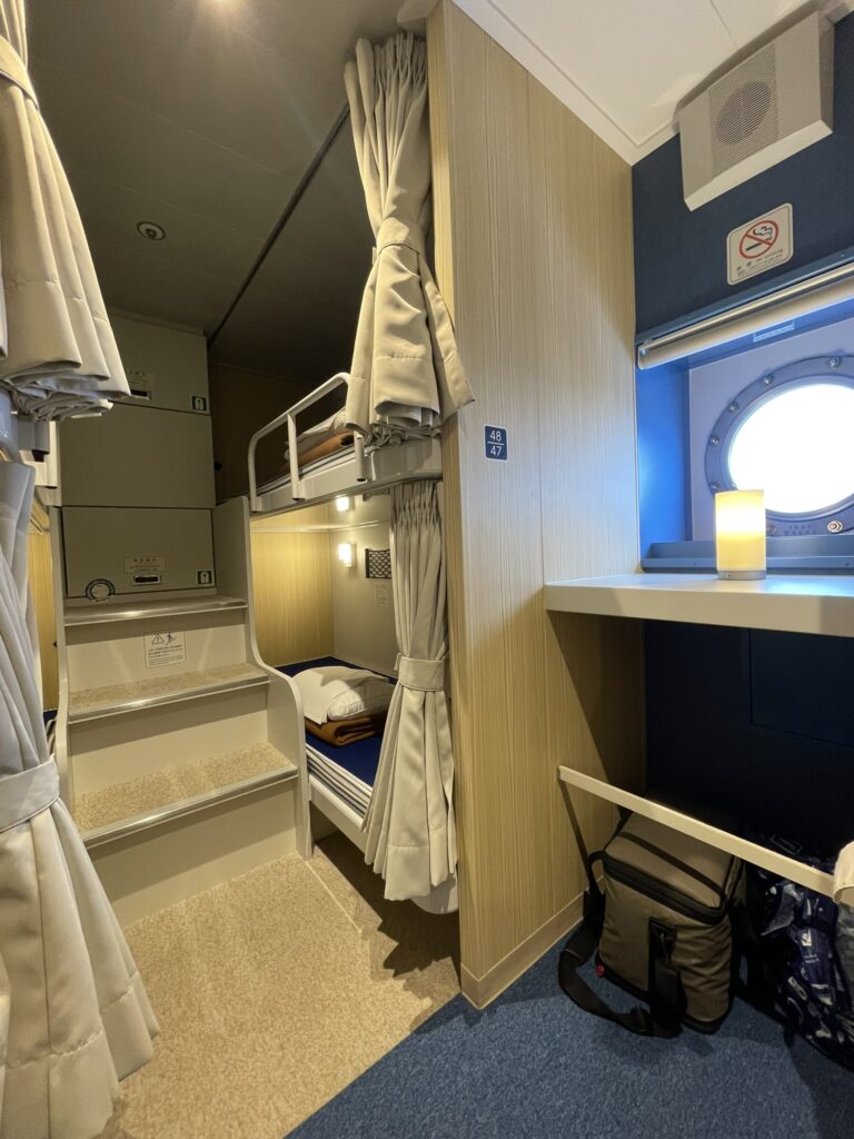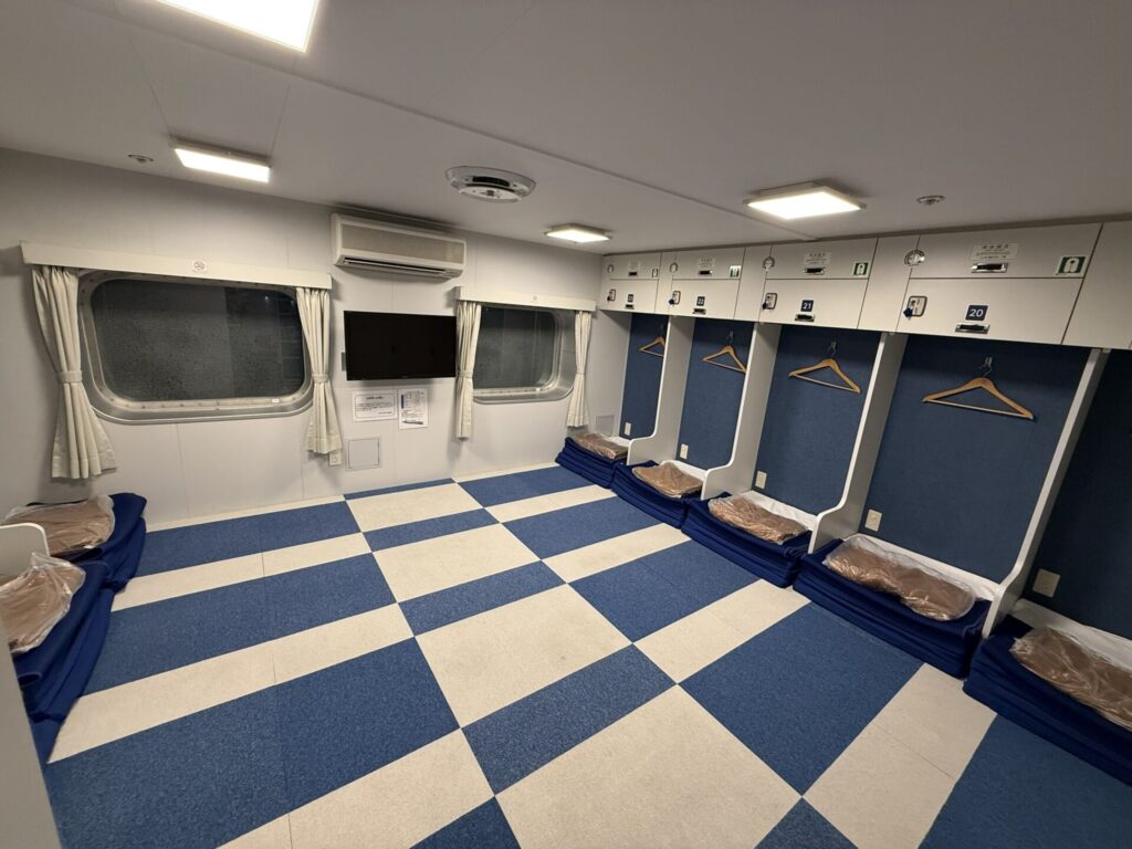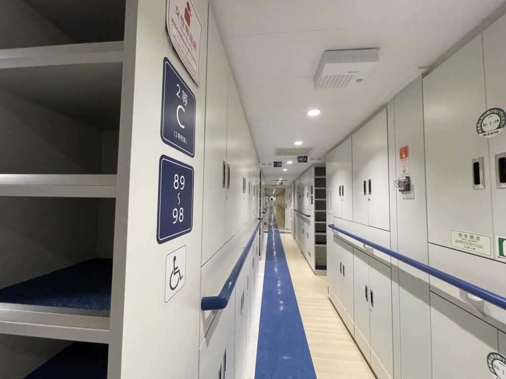 共用の和室スタイルの1等室は、頭部の仕切りでプライバシーに配慮し、各席にコンセントと寝具、返金式ロッカー、ハンガーが完備。部屋内にゴミ箱、スリッパを用意する。主に5甲板で展開し、女性専用ルームも用意。