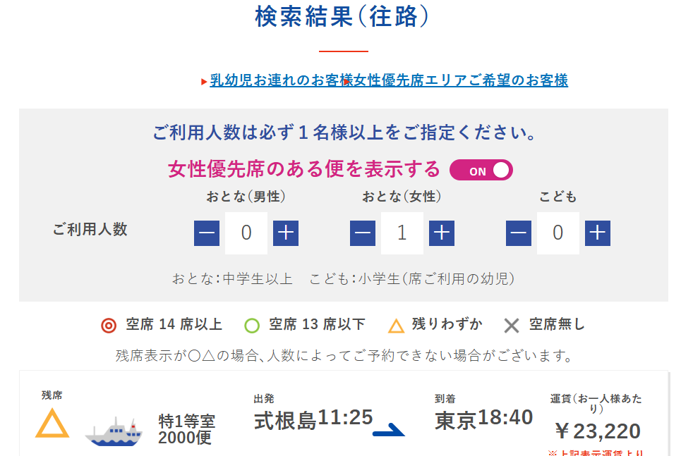 女性の方は予約時に電話やインターネットで「女性専用ルーム」を指定すれば、より安心。特にインターネット予約では、一見、満席でも、「女性優先席のある便を表示する」をONにすると、空きがある場合があるので、チェックを忘れずに。
