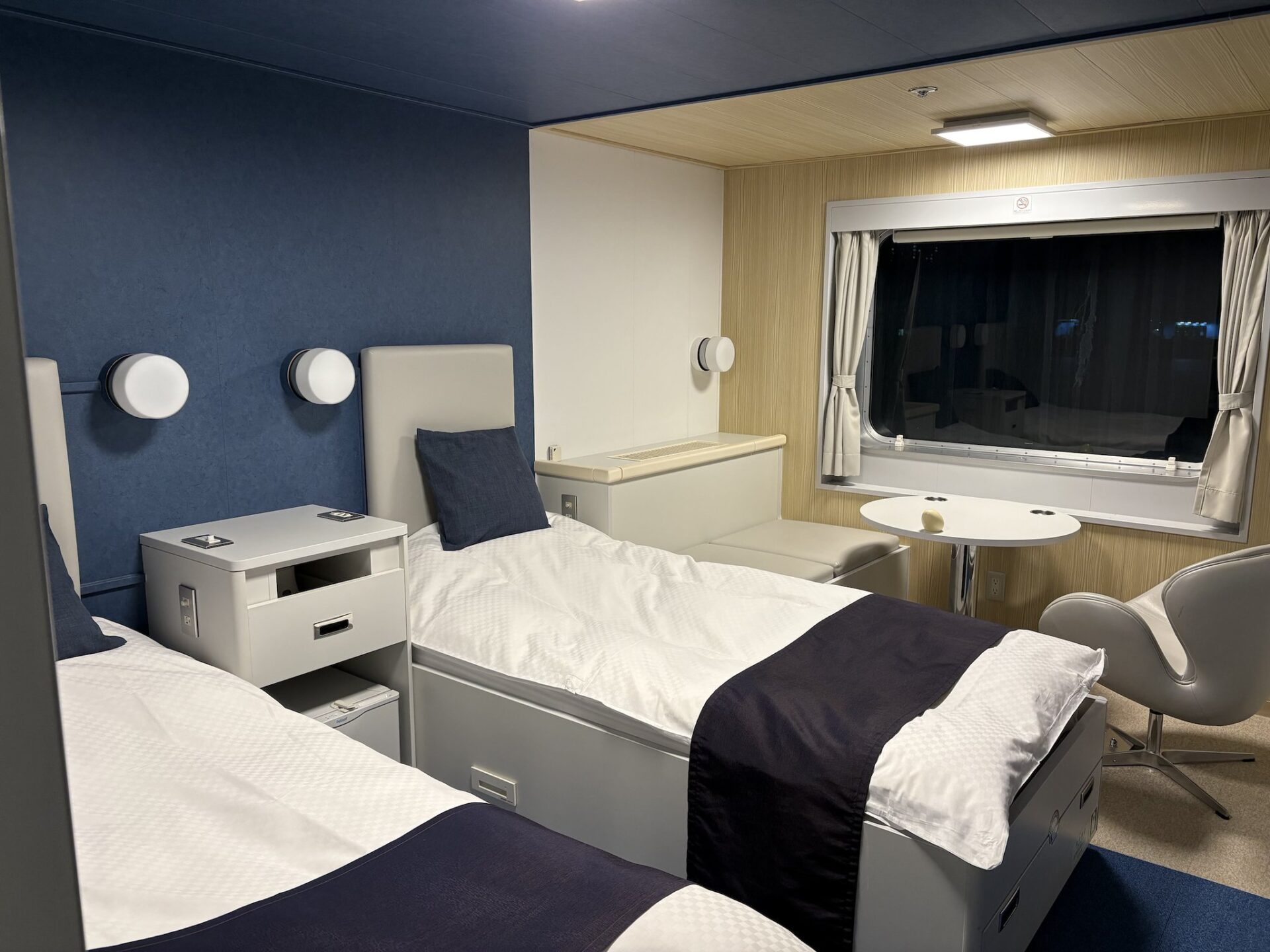 6室ある特等室は、シャワー・トイレ付きのツインベッドルーム。湯沸かしケトルや冷蔵庫、机、浴衣、アメニティなどがついて、ホテルの部屋と代わりありません。小さなお子様連れでも安心して船旅ができます。