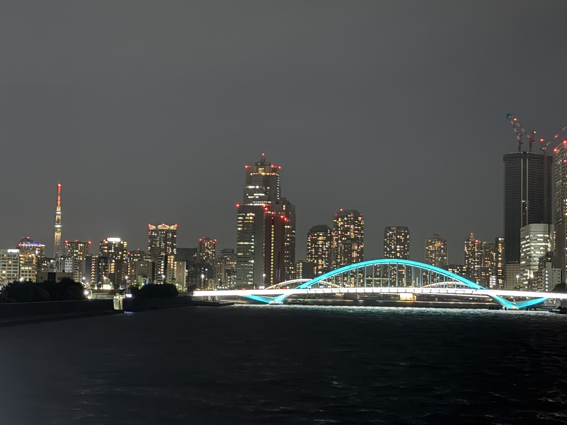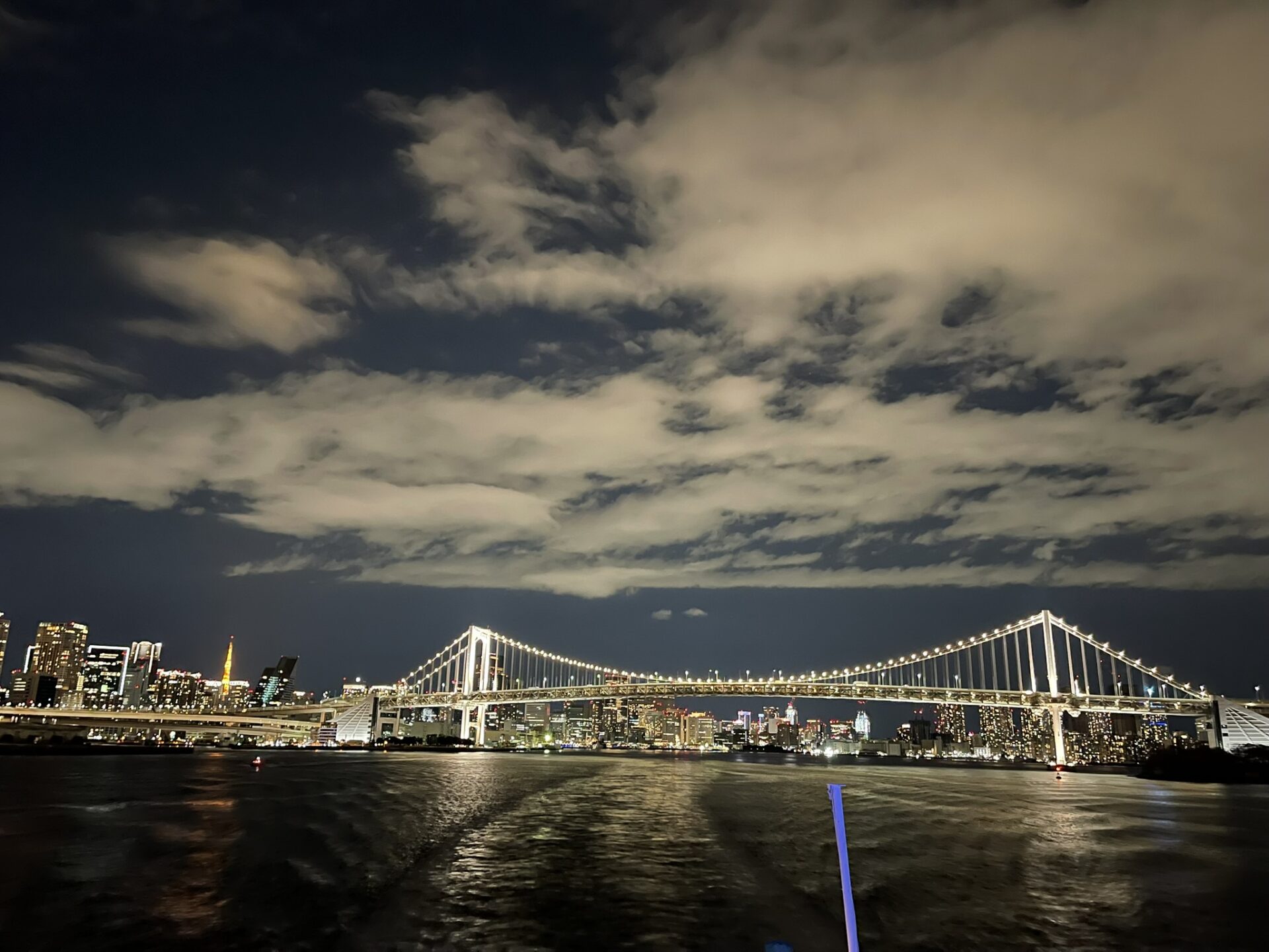 出港してレインボーブリッジをくぐるまで、約5分。橋の裏側を見る人でデッキが賑わいます。その後、歓談する方も羽田空港を過ぎたあたりで解散モードが多いです。