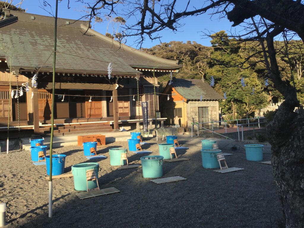 式根島の星祭りでは、厳寒の夜、白褌(しろふんどし)を締めた厄年の男性と住職、白装束の女性らが水行によって身を清めます。