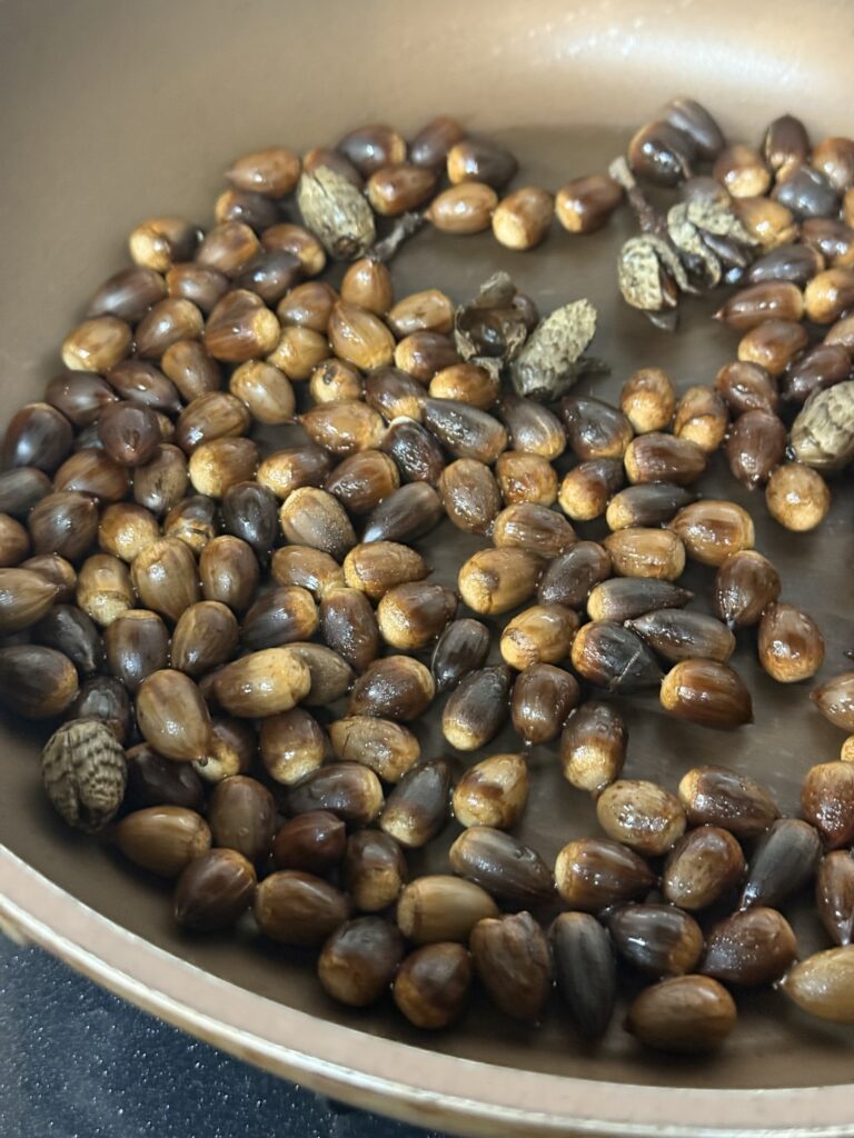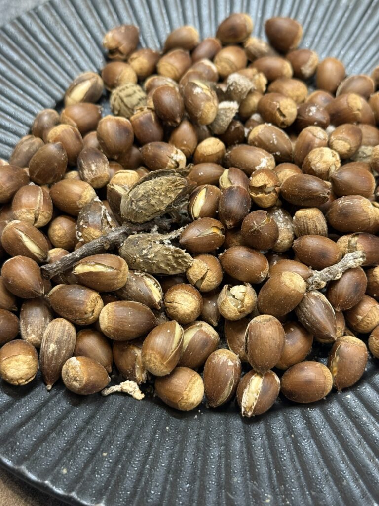 完成です。女将が3つに裂けたどんぐりの帽子(殻斗)も一緒に炒ったのが、なかなかオシャレなアクセントになっています。