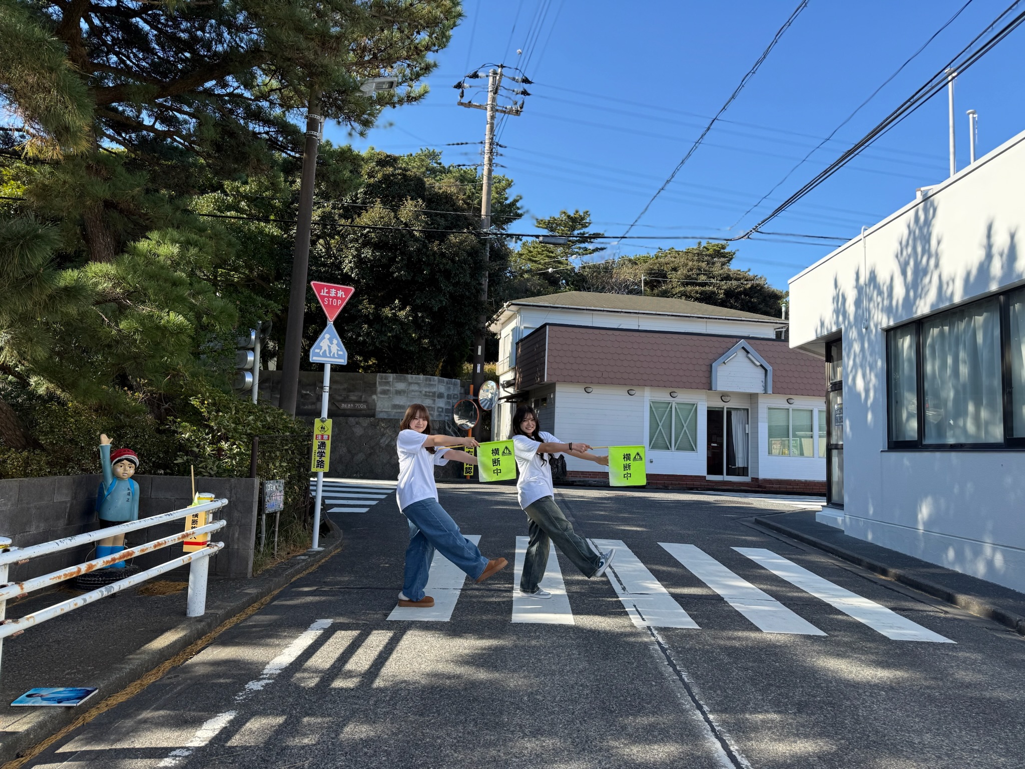 島道守さんは式根島駐在所横で、島道正くんは式根島小学校前で島の交通安全を推進しています。