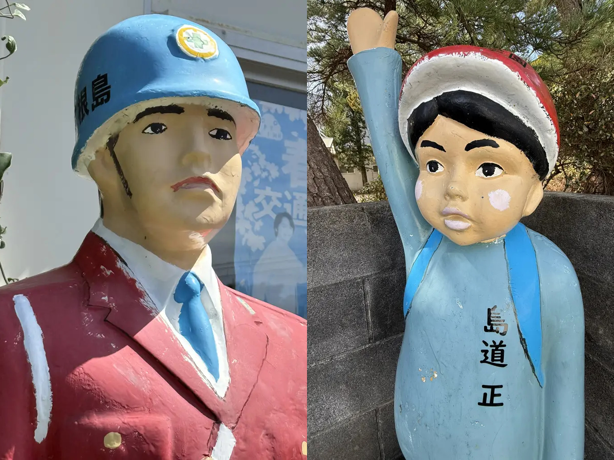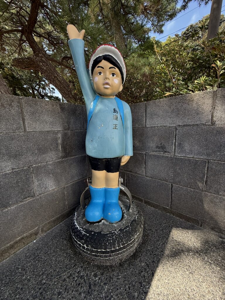 観光客もよくわからないまま思わず近寄って、記念撮影するのが、式根島の交通安全キャラクター「島道守(しまみちまもる)」さんと「島道正(しまみちただし)」くんです。