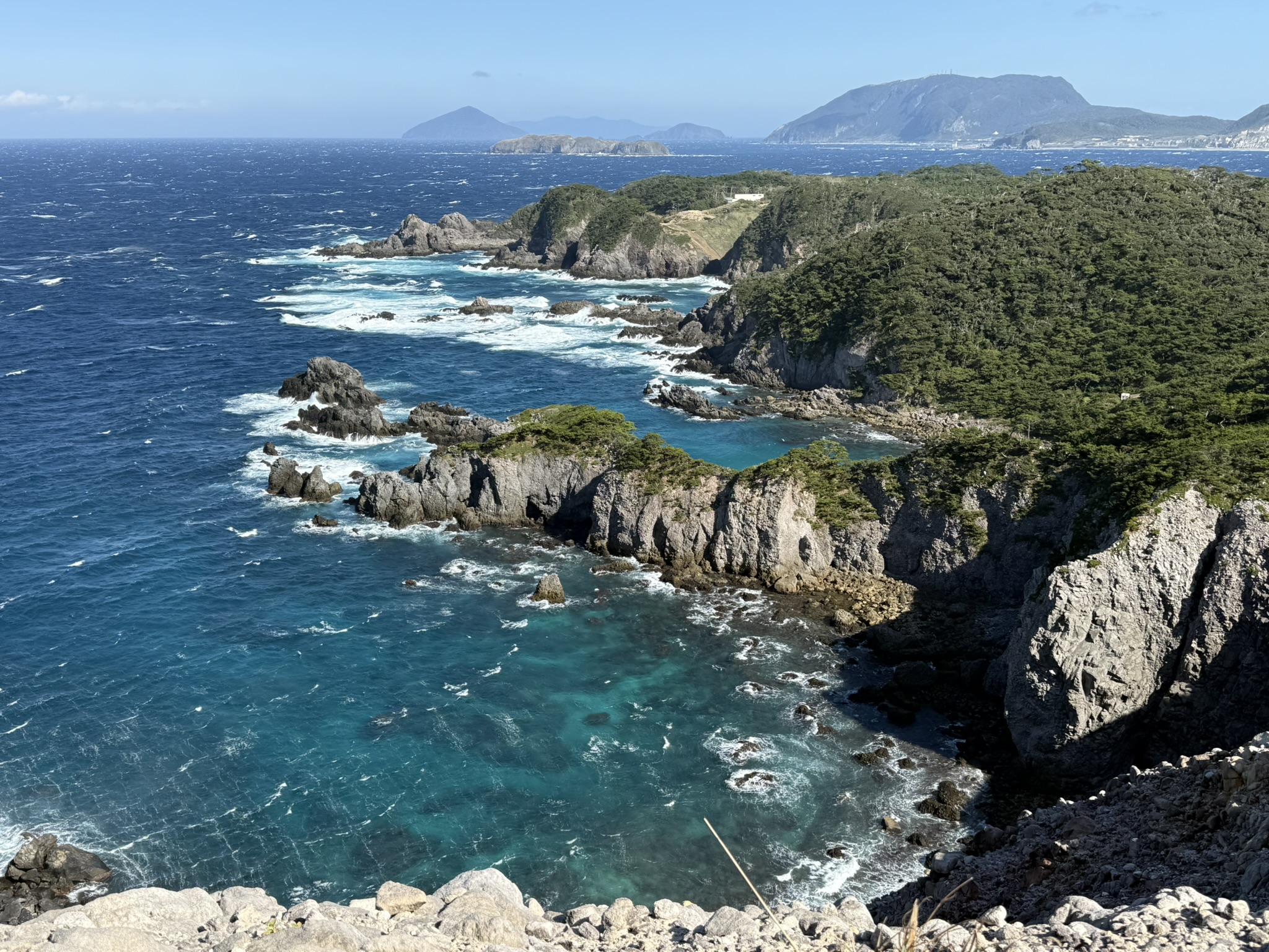 式根島の溶岩は「流紋岩質(りゅうもんがんしつ)」といって、白っぽく、非常に粘り気が強い性質を持っています。この粘り気の強い溶岩が、火口からゆっくりと流れ出し、冷え固まる過程で独特の凹凸を生み出しました。丸山の頂上付近にある「神引展望台」からは、この溶岩が作り出したダイナミックなリアス式海岸を一望できます。