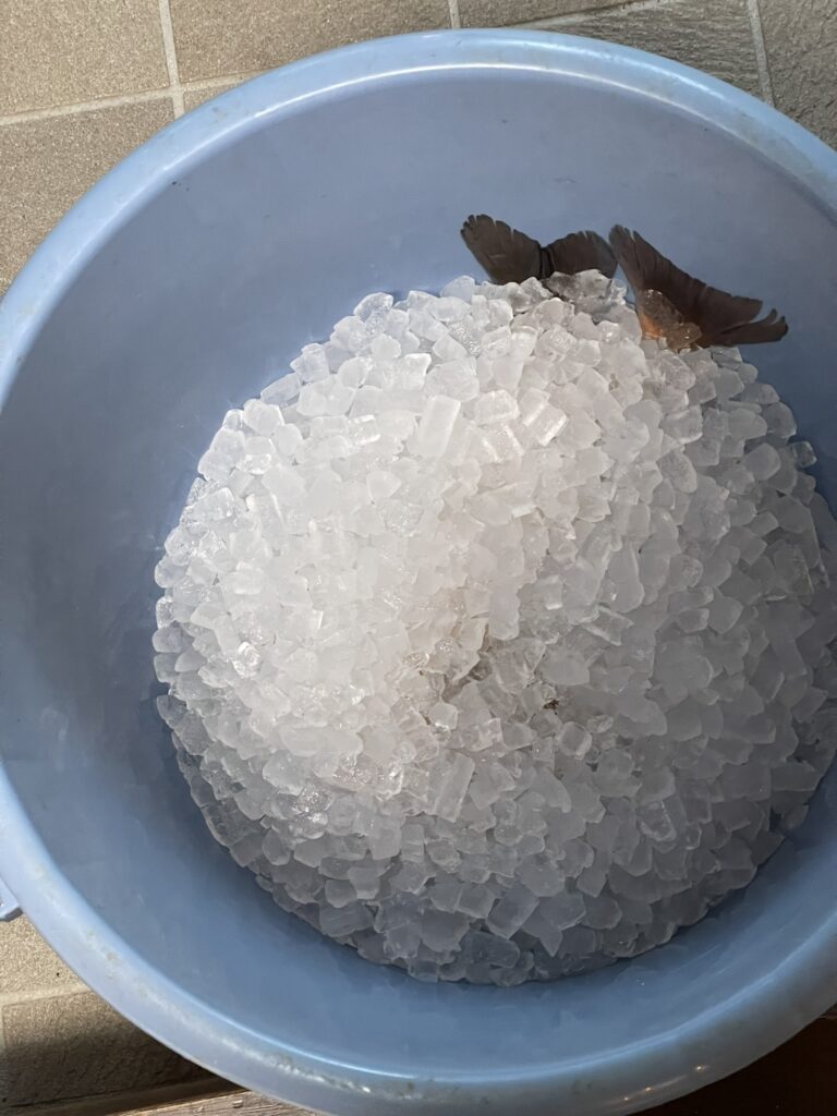 かたまりとなった塩は、鯛の身に触れないように外して、燃えるゴミに捨てます。そこらに塩を捨てると塩害になって草木が生えなくなるので、くれぐれもゴミとして捨ててください。