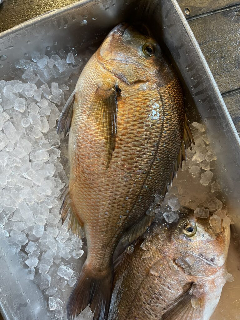 続いて、立派な、ハトヤレベルの真鯛を調達しないといけません。本来、ここから、すでに大変です。ところが式根島には、天然の海水で素晴らしい真鯛を育てている「式根島養殖場」がありますので、問題ありません!
