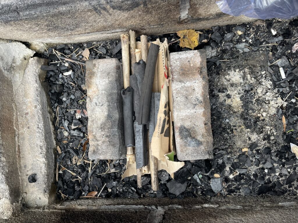 ひだぶんのBBQスペースを予約して、炭や着火剤を商店で買ってきて、まずは火起こしです。不要な段ボールや枯れ枝など、あるものは何でも焚付に使います。