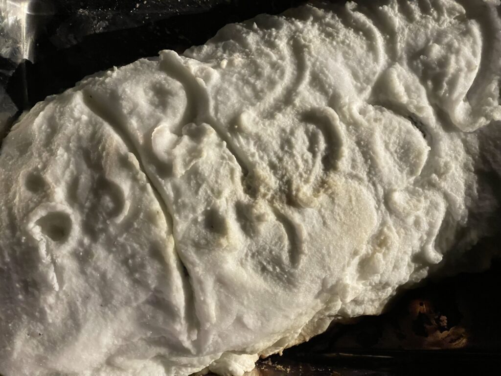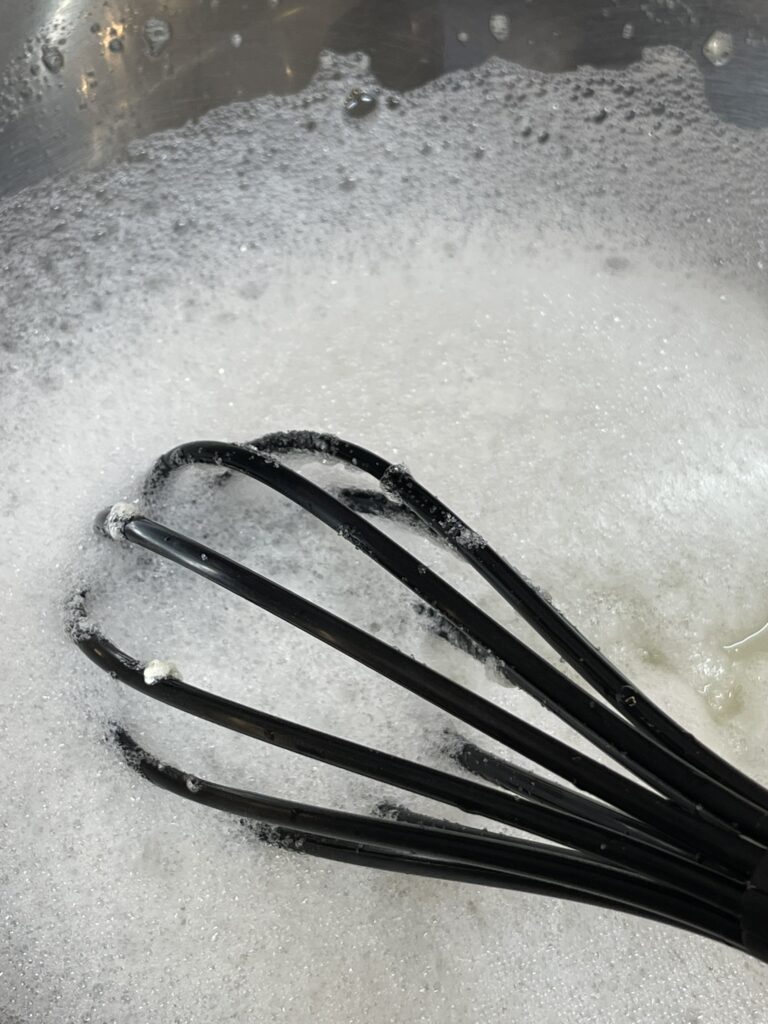 大きなボールを持ってきて、ひだぶんミールキット「真鯛の塩釜焼きセット」についてきた、指示通りに計量カップで水を150mlをはかって入れ、次に乾燥卵白をいれ、軽く泡立てます。混ざったら塩を少しずつ入れ攪拌していくと、ある時点でふわっとクリームのようになりました!