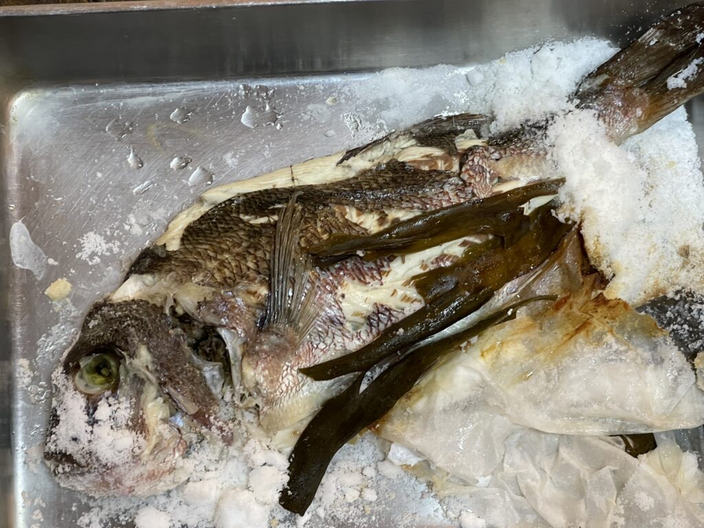 本番用の大きなバットをもってきて、まず、真鯛の大きさくらいに塩を伸ばします。その上にお腹に明日葉を詰め、昆布とクッキングペーパーでくるんだ真鯛(レシピ通り)を置き、塩で隙間なく包んでいきます。鯛の身に直接、塩がふれてしまうと、しょっぱくなって台無しになる危険性があるので、慎重にやっていきます。それにしても、この懐かしい感じ・・お砂場遊びそのものです。