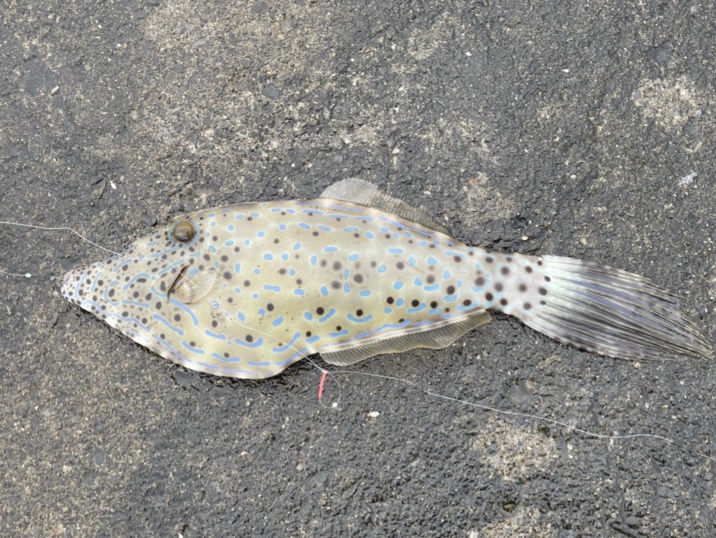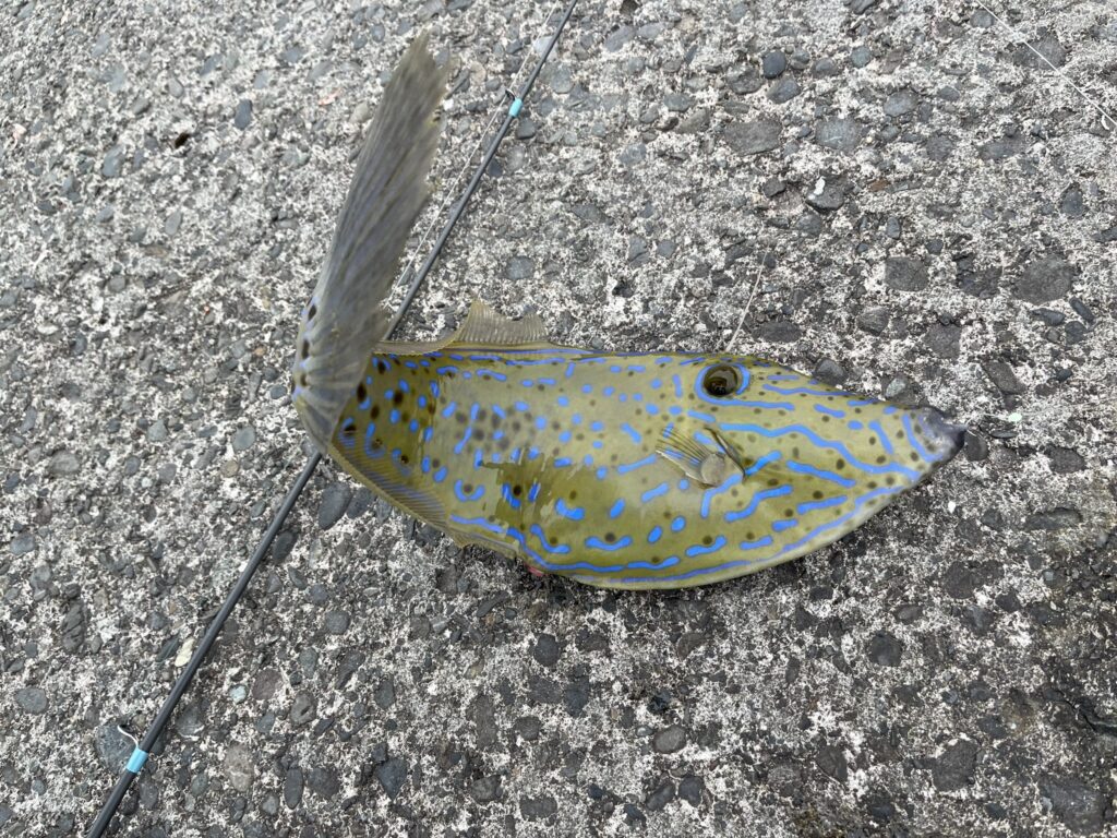 桟橋から海中を除くと、独特な形で泳いでるのがすぐわかるソウシハギ。エサ取りで知られるが、最近特に増えているように見える。蛍光色のようなブルーのまだら模様といい、見るからに毒々しく、内臓や消化管にパリトキシンという強毒を持つ。カワハギの仲間らしく、キラキラしたものを好むのか、カゴ釣り時、カゴより高いアポロウキを複数個体で取り囲んでつつきまわすのが、壊されそうで困る。