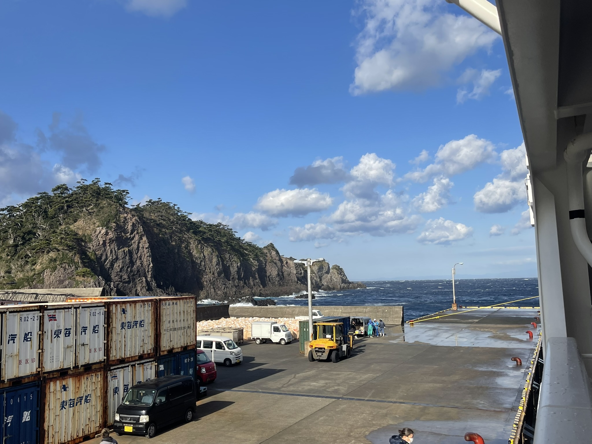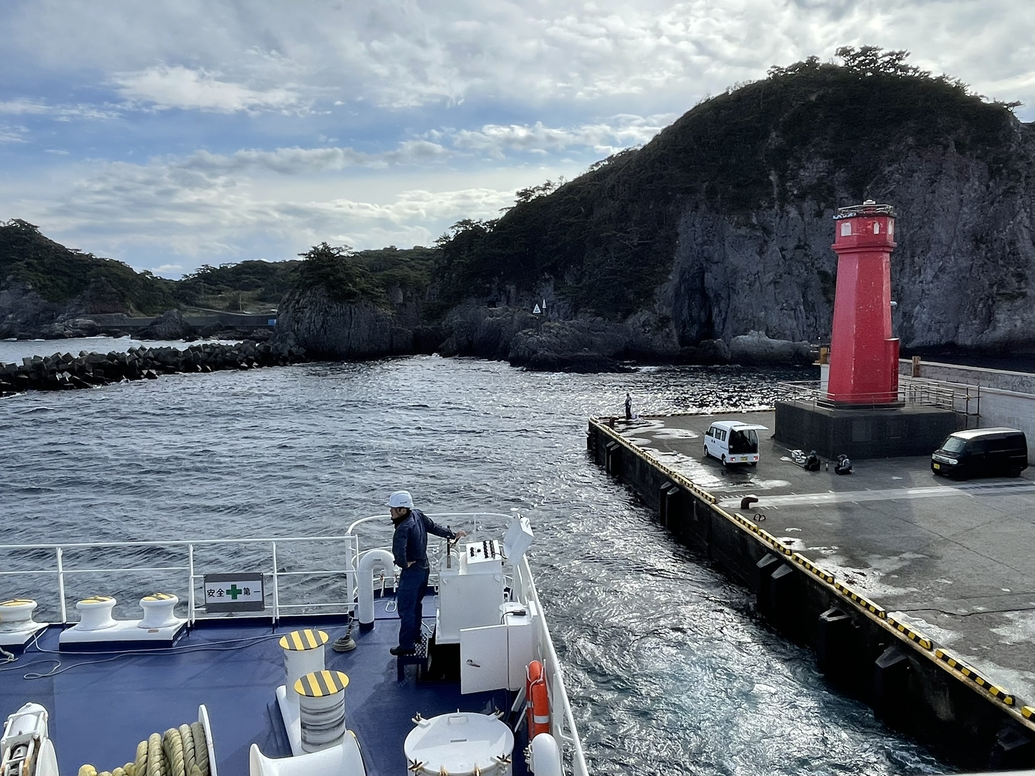 - さるびあ丸(大型客船・本船)や、あぜりあ丸(下田船)ほか、船の着岸前後30分~は両先端のごく一部を除いて釣りができません。釣り道具は速やかに全て片付けて、離島の生命線である港湾作業の邪魔にならないようにしましょう。着岸時刻をあらかじめ調べてから釣り計画を立てると効率的です。