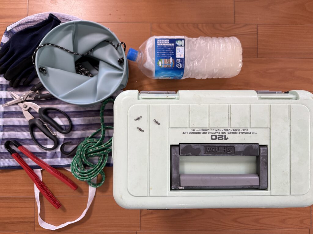 水汲みバケツ、クーラーボックス、保冷氷、ハサミ、魚ばさみ、プライヤー(針外し)、仕掛け接続に便利なサルカン、自転車紐、バッグ