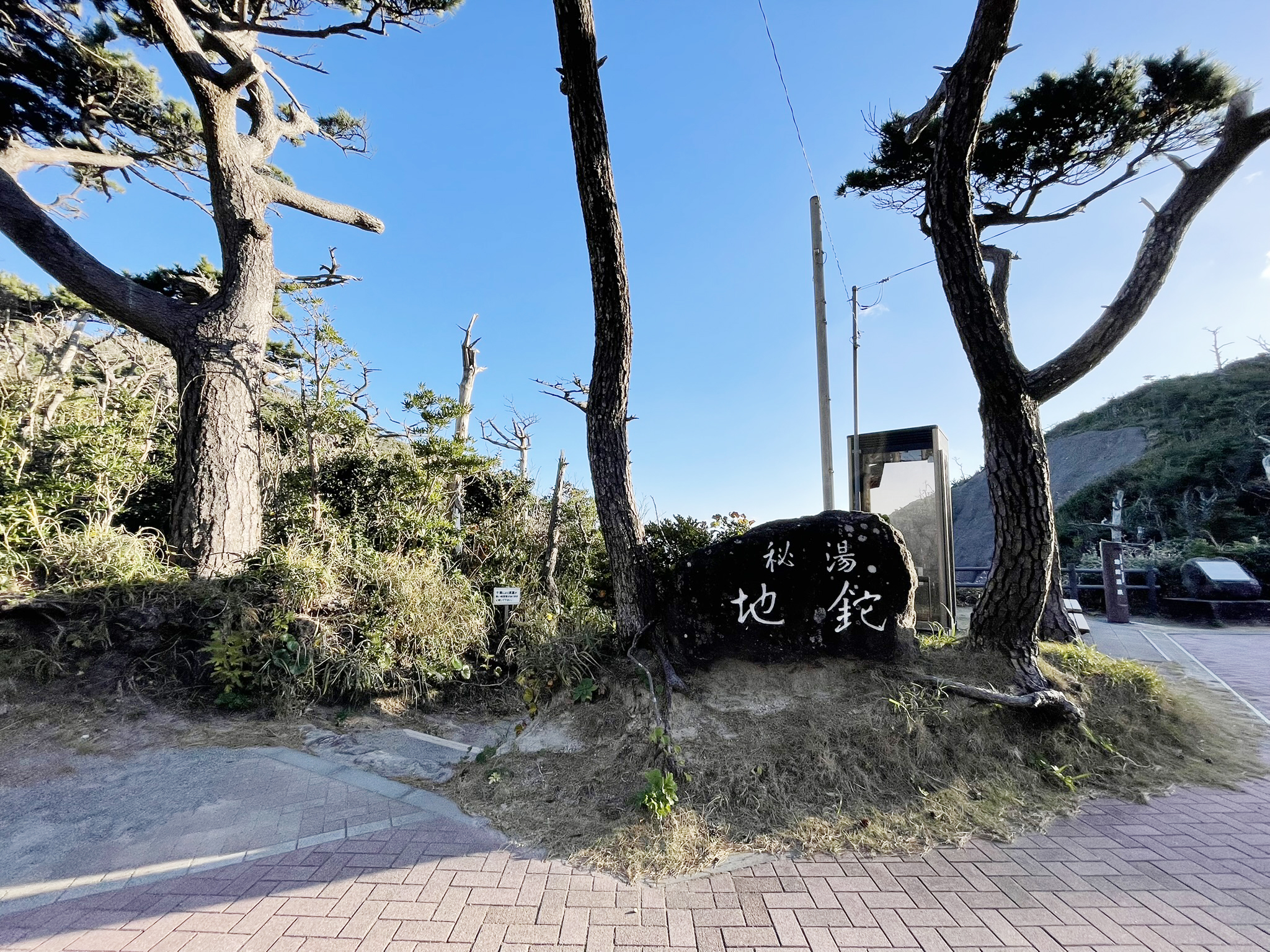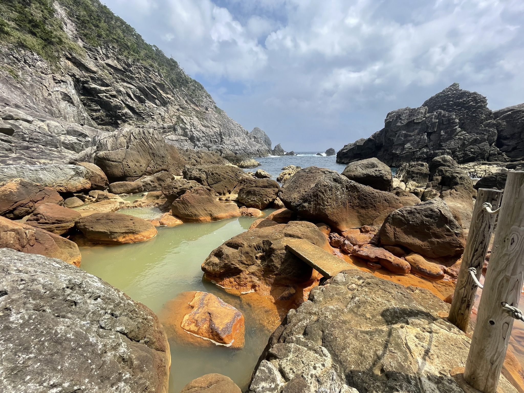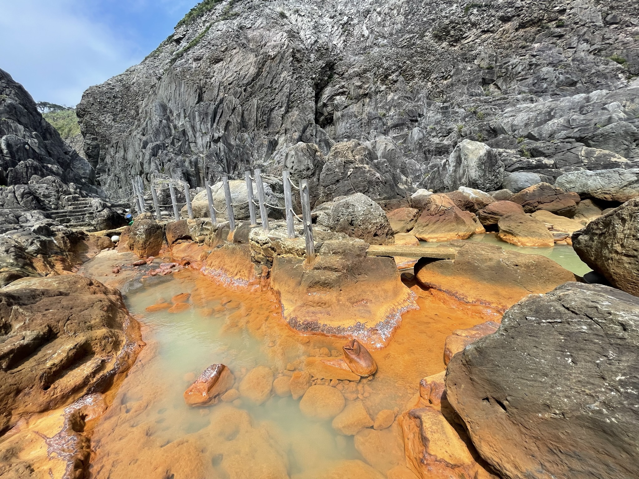式根島中心地の東駐車場から193段の急階段で高低差50m近くを降り、たどり着く野趣あふれる海岸線の野天風呂。高温80℃の源泉のため、海水が流れ込む満潮時刻の前後90分が入り時。泉質はナトリウム・塩化物強塩温泉で、含有する鉄成分が酸化して刻々と色を変え、析出物はさび色を帯びる。