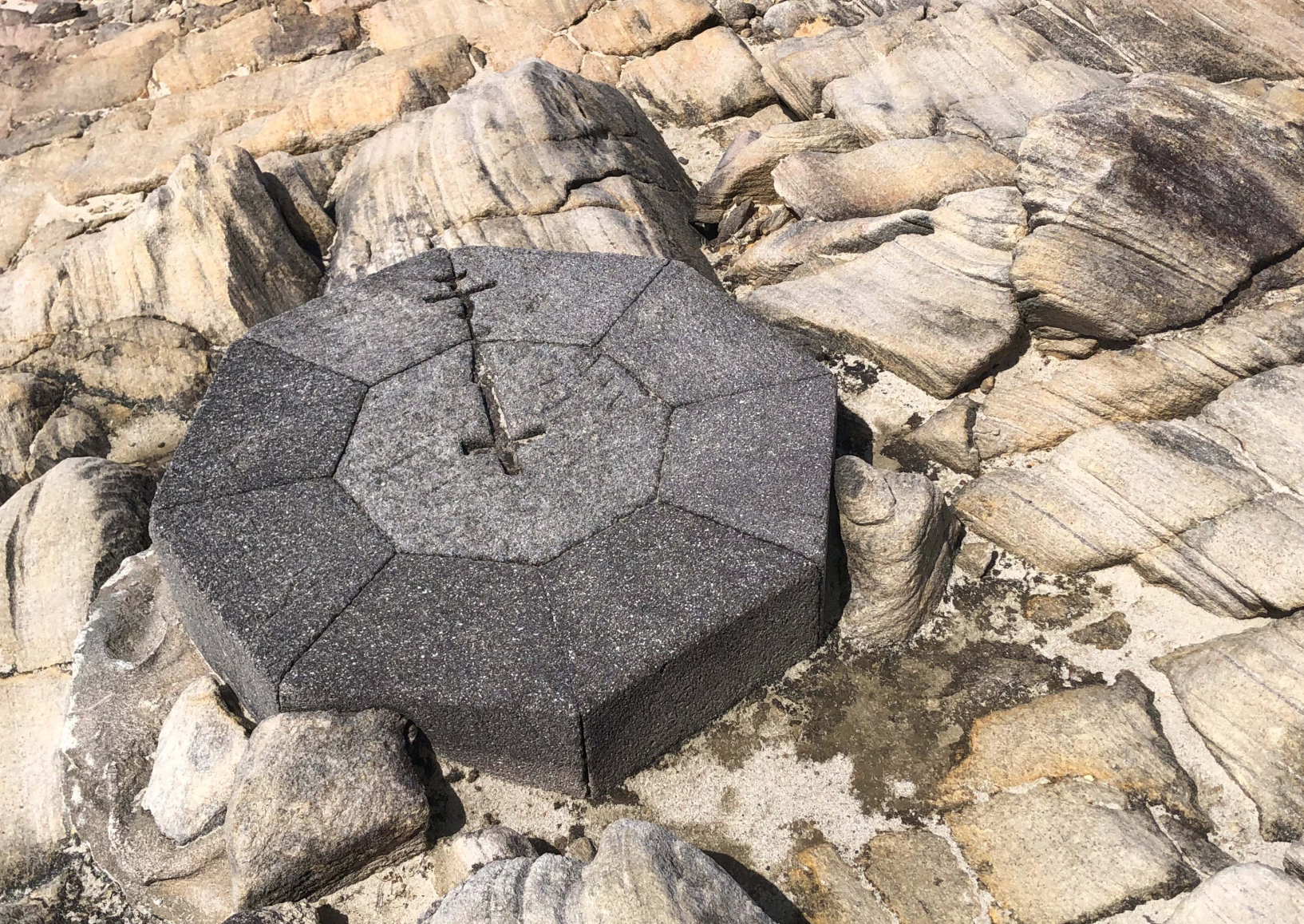 式根島中心地から地鉈温泉に向かう途中にある四角い穴が「湯加減の穴」。手を入れると温度と湿気を感じ、足付温泉の湯加減がわかるという。せっかくだから体験してみよう!ただし、たまに猫が入ってます。
