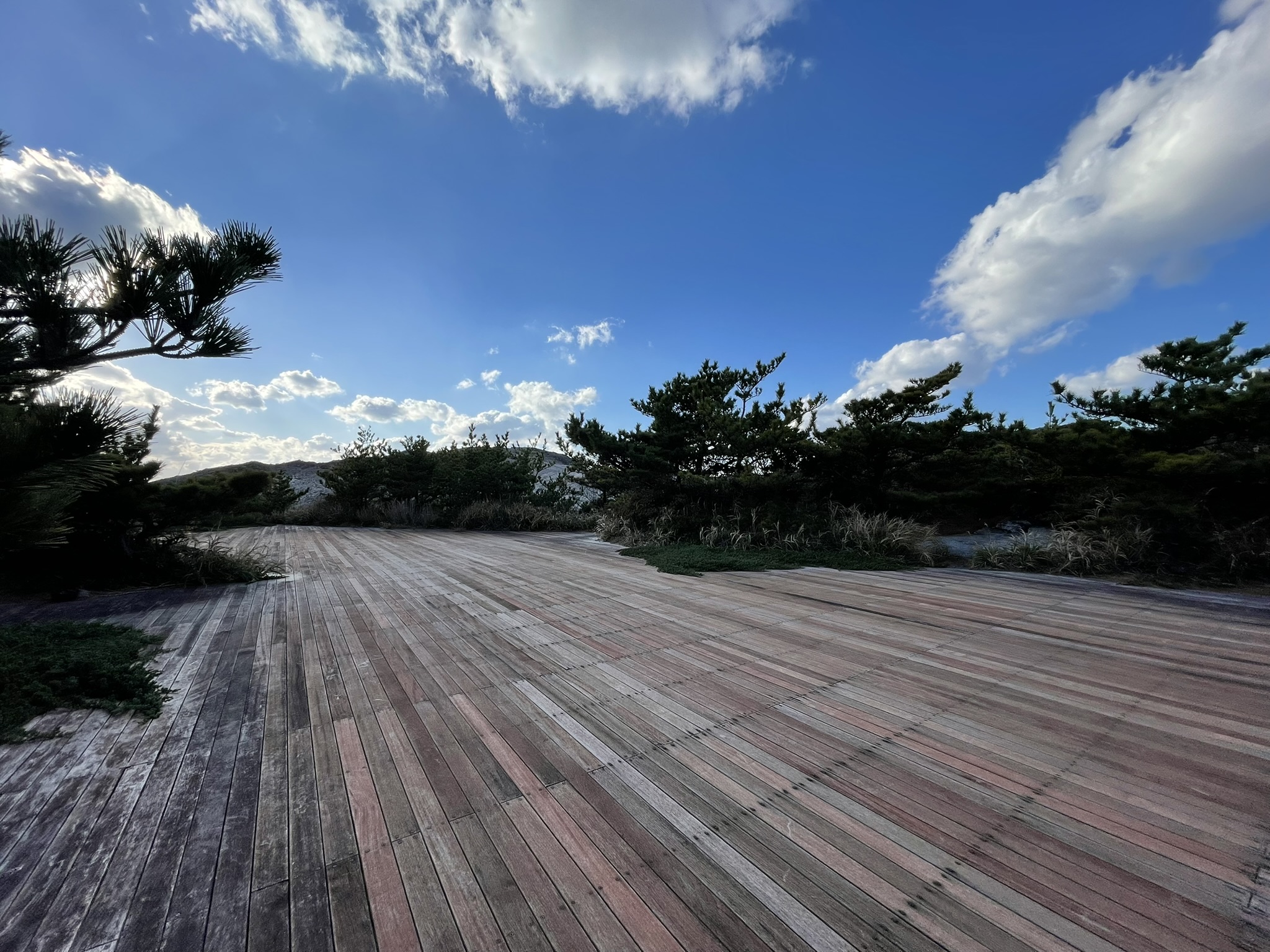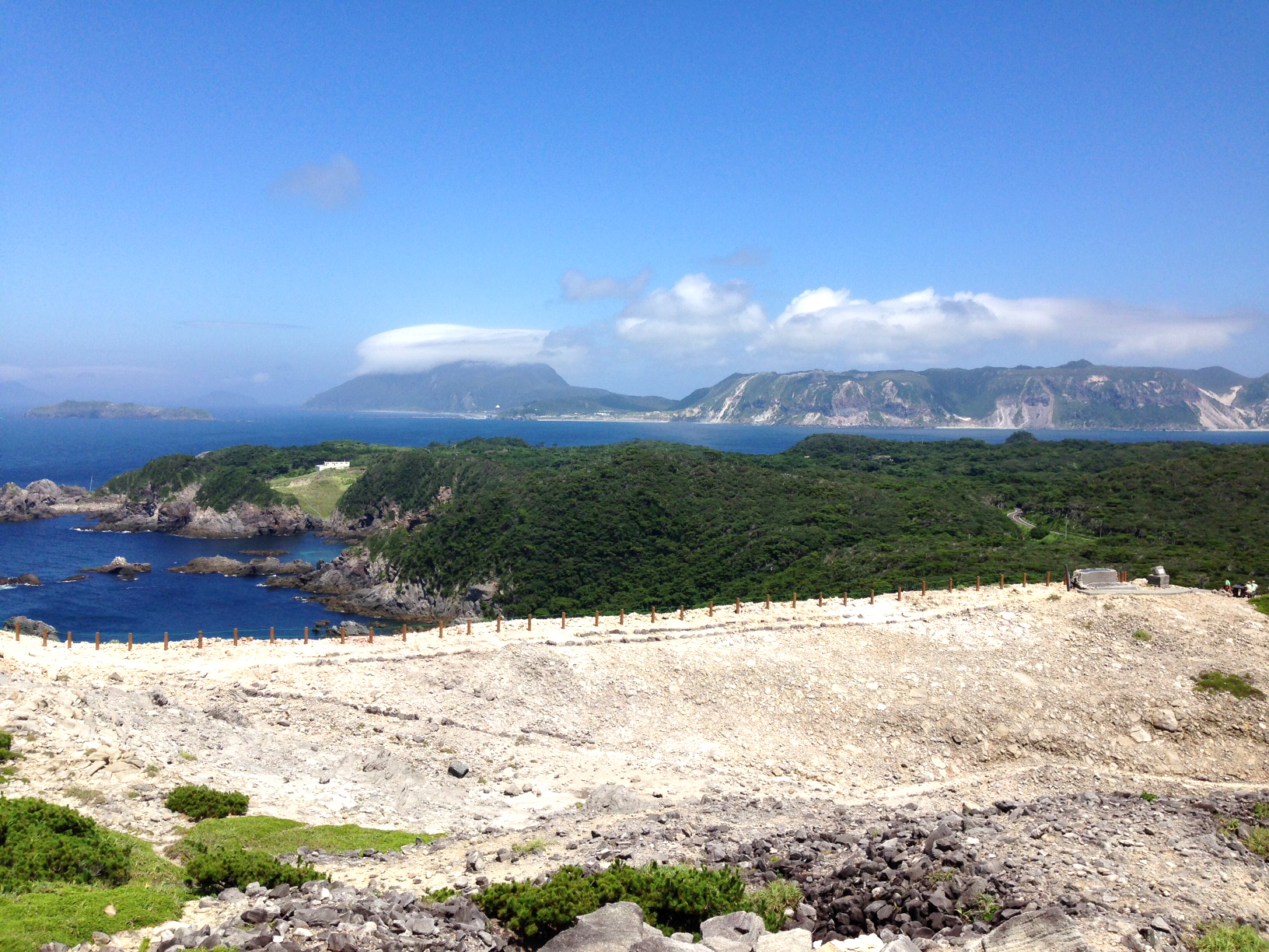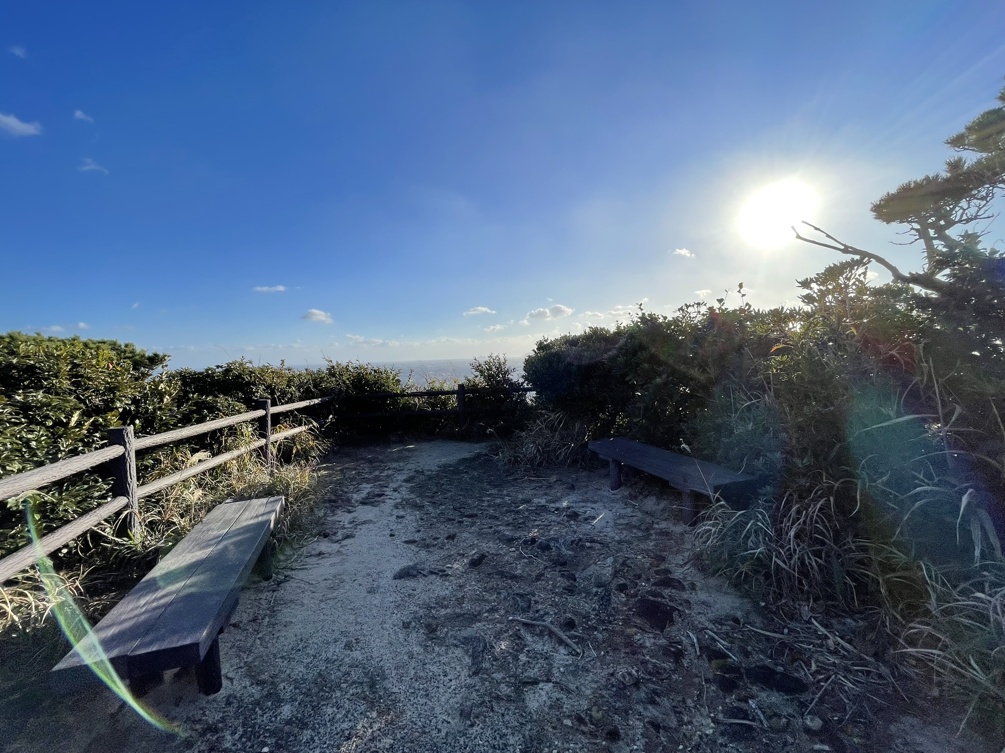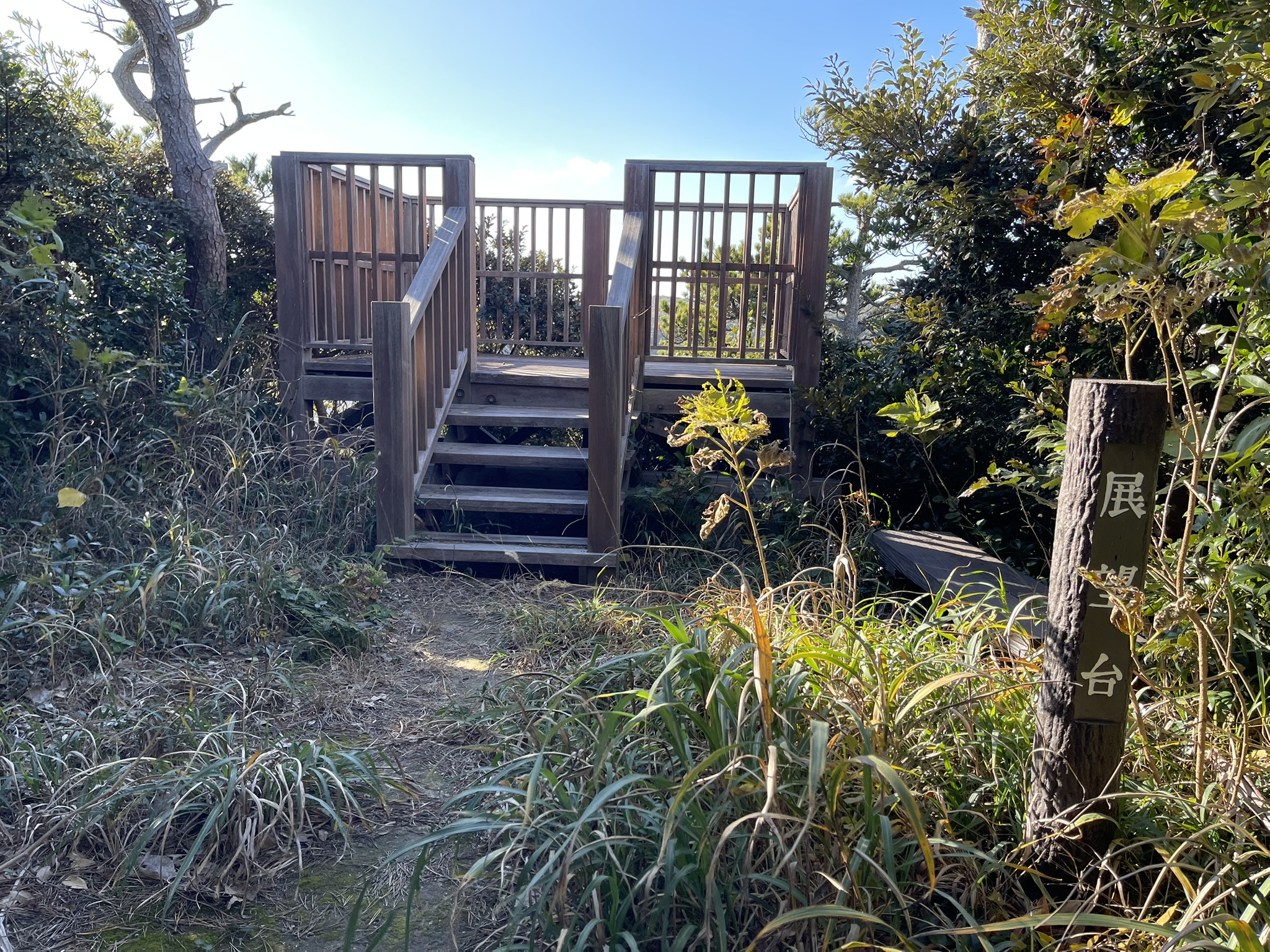 地鉈温泉入口すぐそばにある足地山の展望台。新島や式根島港を見下ろし、向かって右手に神津島を望む。この展望台入口付近から足付温泉や松が下雅湯方面に徒歩で降りることかできるルートがある。
