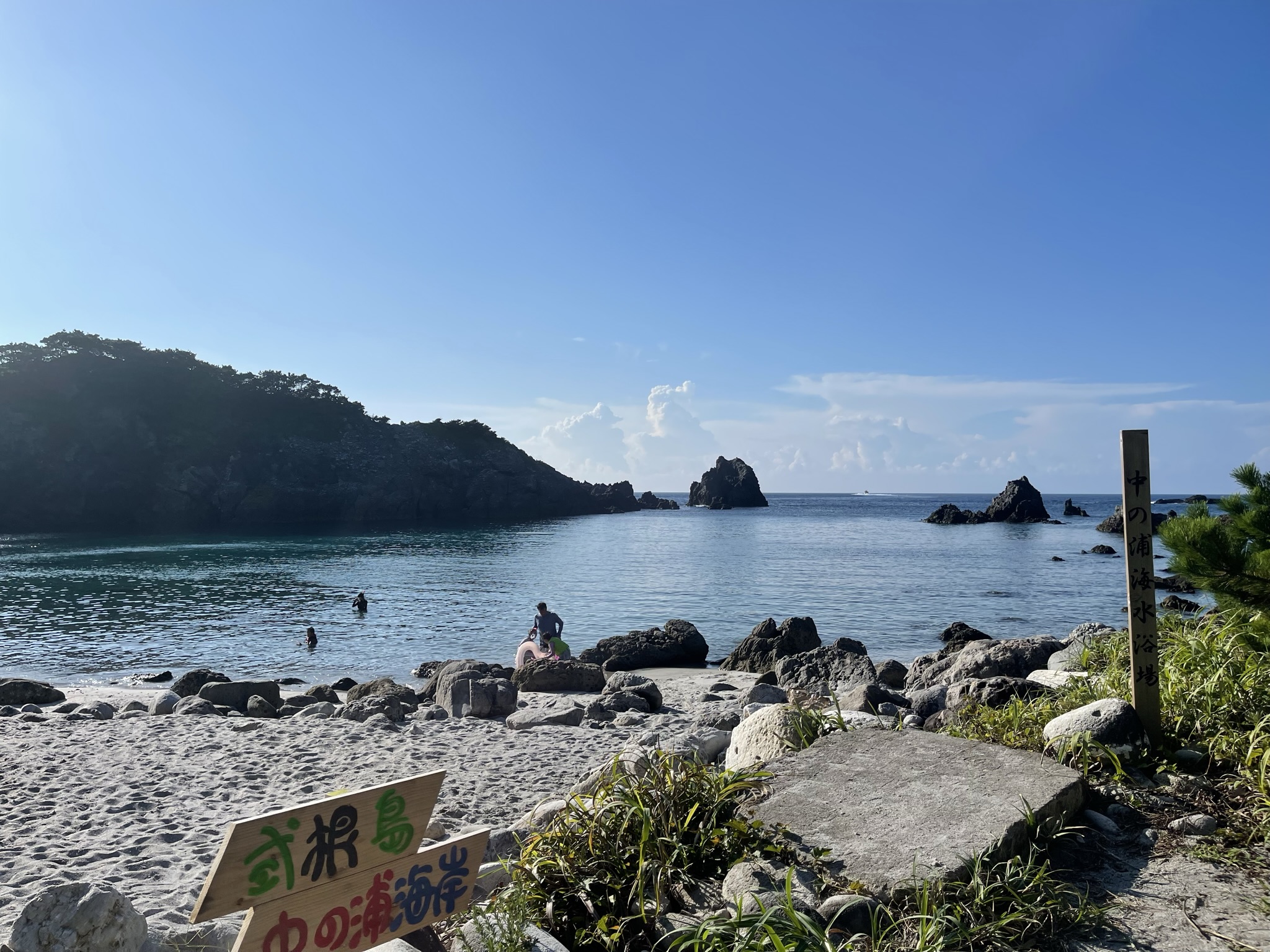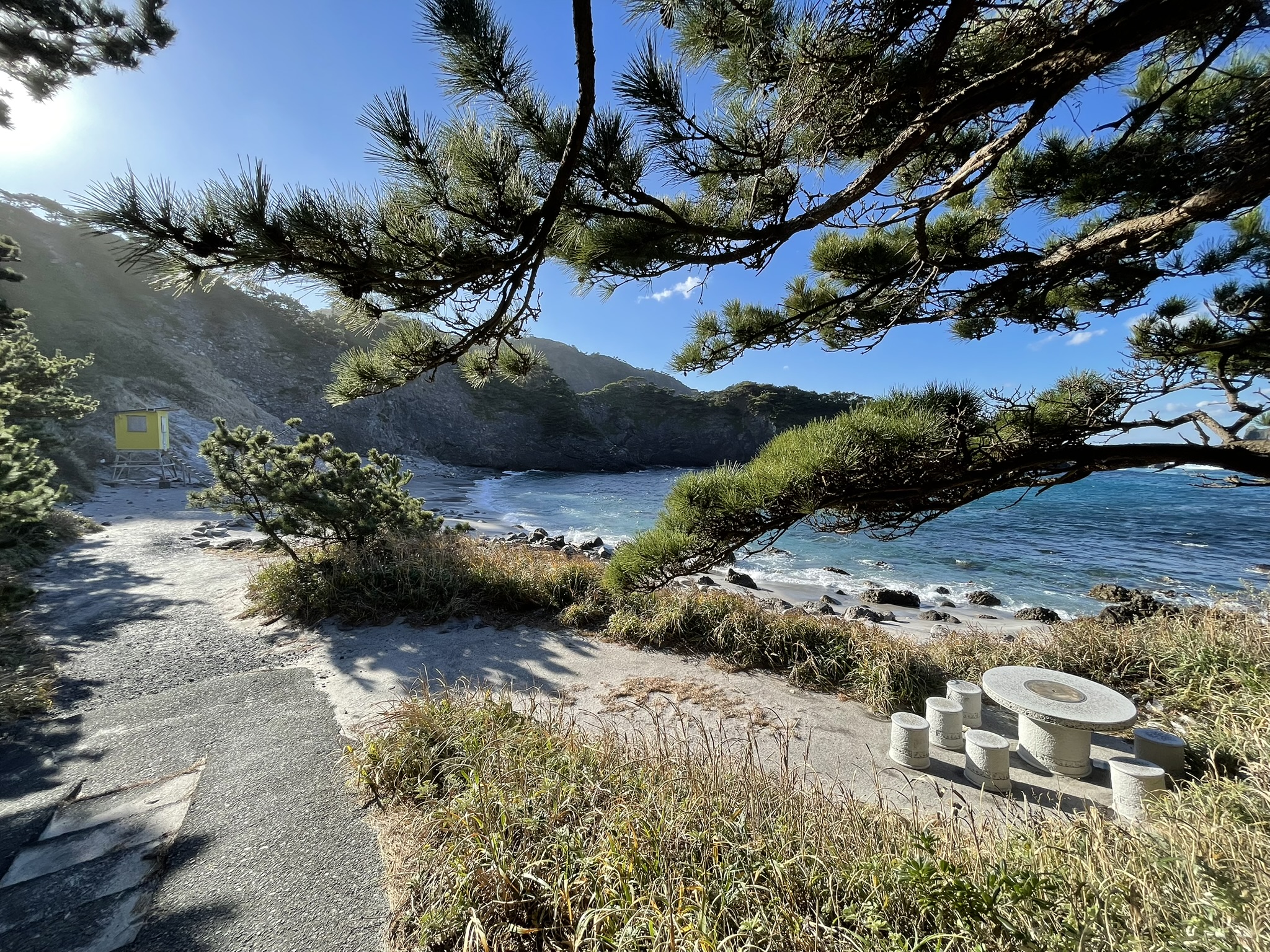 式根島北側に連なる3つのビーチの1つで一番西側にある大浦海水浴場。遊歩道に入る手前に、道路を歩いて寄って行こう。ルートを時計回りにとって、日没時間に合わせて、大浦海水浴場をゴールに設定し、夕日を眺めるプランもおすすめ。