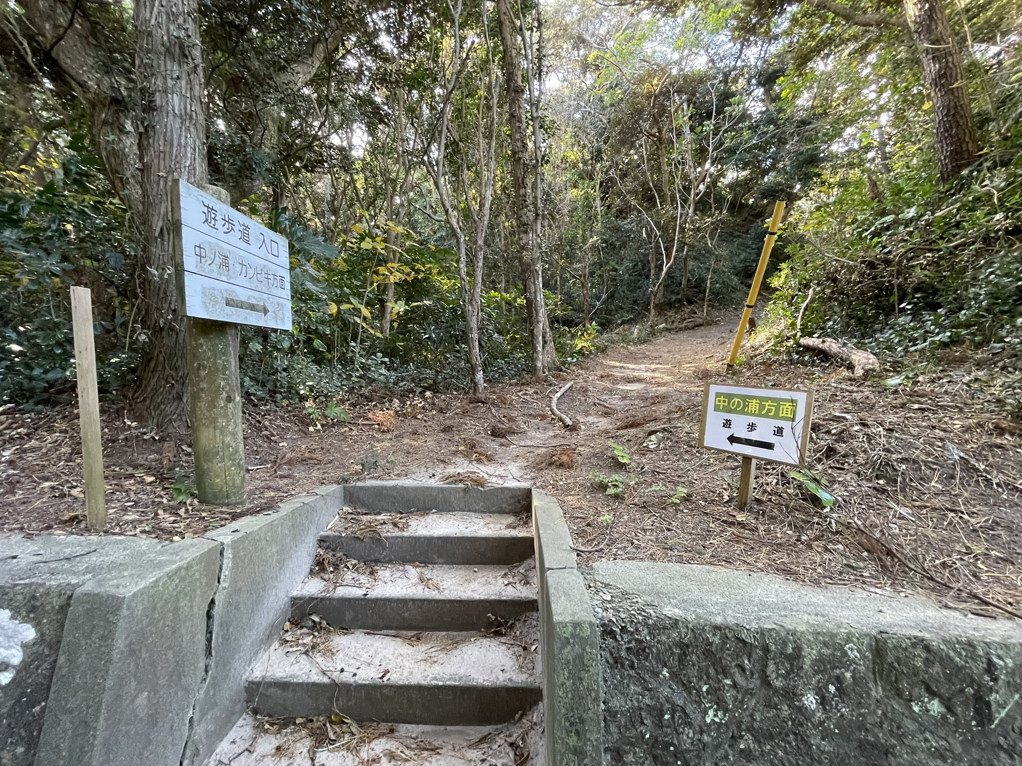やや深く、海底に変化がある、中の浦海水浴場はシュノーケリングの人気スポット。遊歩道から階段で少し下れば、広々としたビーチが現れる。