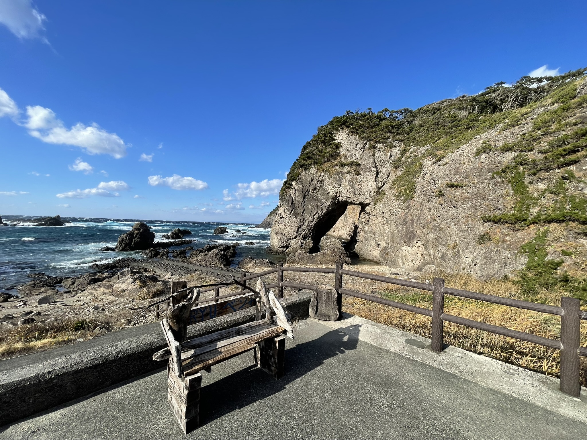 御釜湾(みかまわん)を見下ろす3つの展望台のうち、もっとも南にあり、階段で上がる立派な造りの第一御釜湾展望台。車道にある森と火山ロード入口からも入れ、徒歩12分~15分で到着できる。