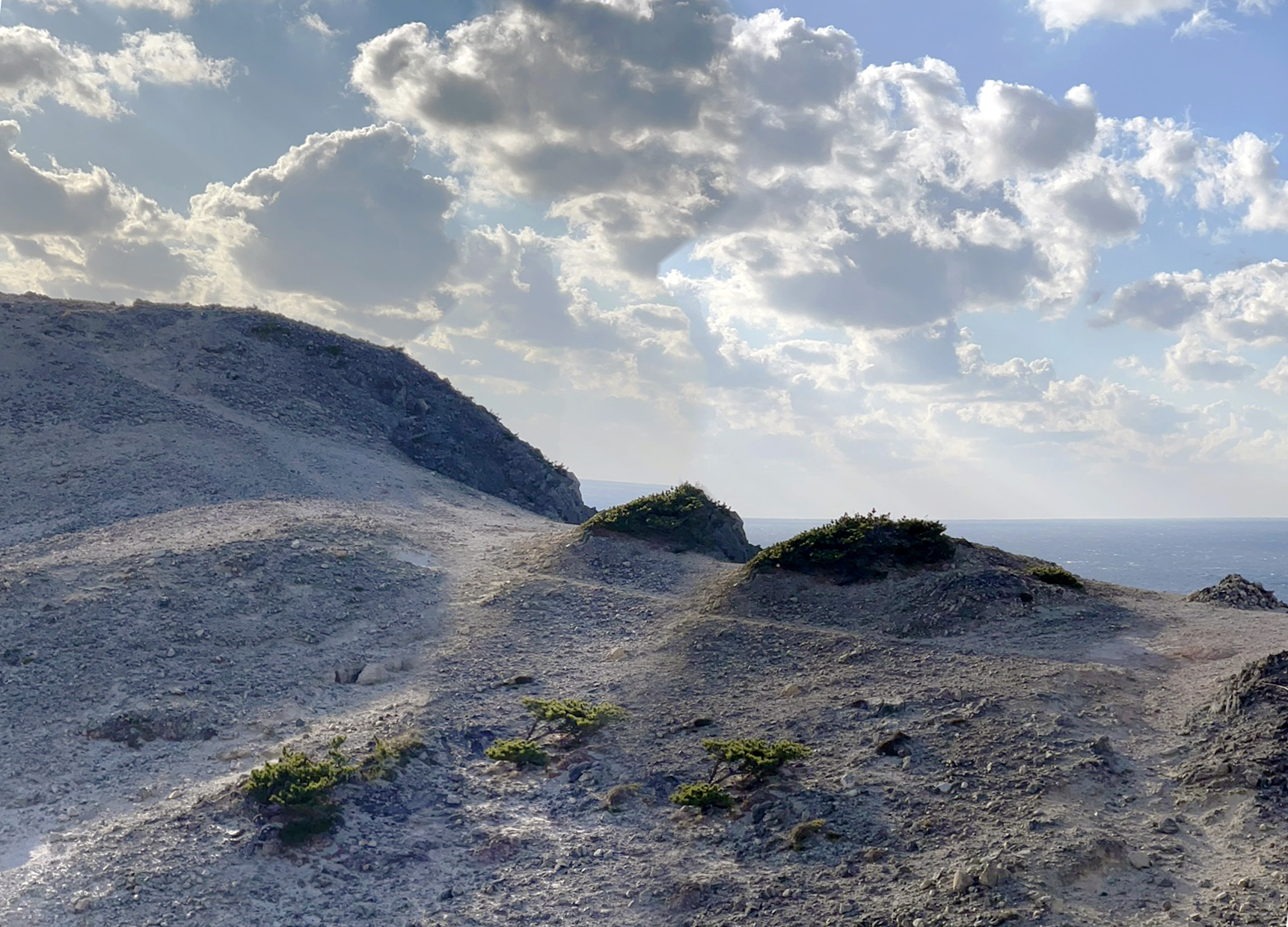 荒涼とした砂漠のような景観が特徴的な唐人津城(とうじんつしろ)は式根火山の古い火口の跡。津城とは昔の言葉で人や魚が集まる場所のこと。踏み跡が続くが、浮石の多い、崩れやすい断崖絶壁にあり、強風時は風速20m以上の風が巻いている。無理をせず、安全第一で行動を。なお、島の最高地点はそばにある佐々木山109mとなる。