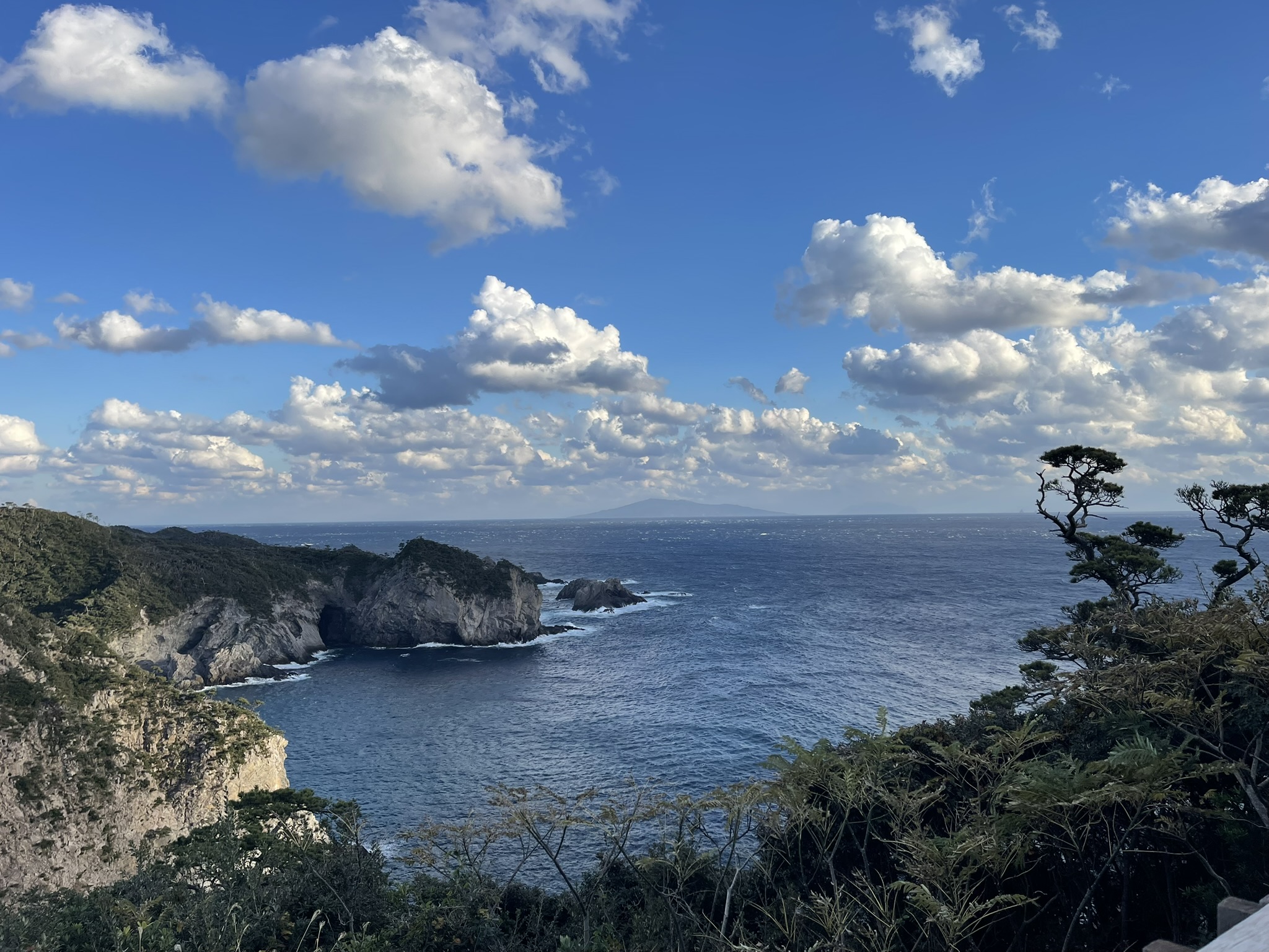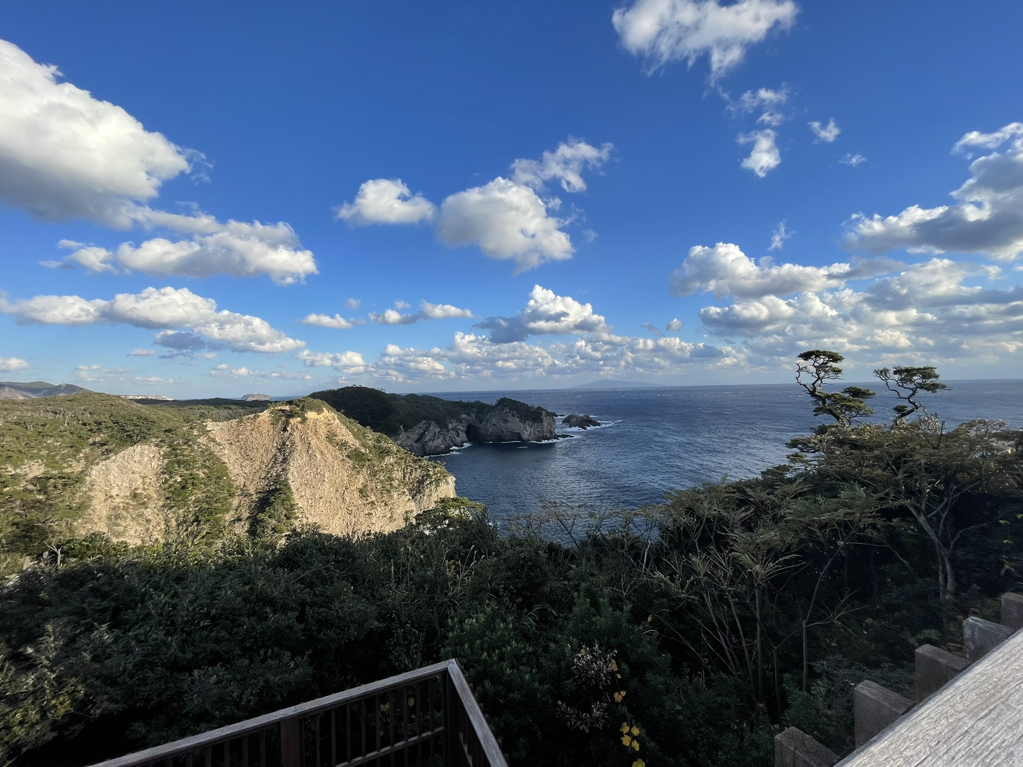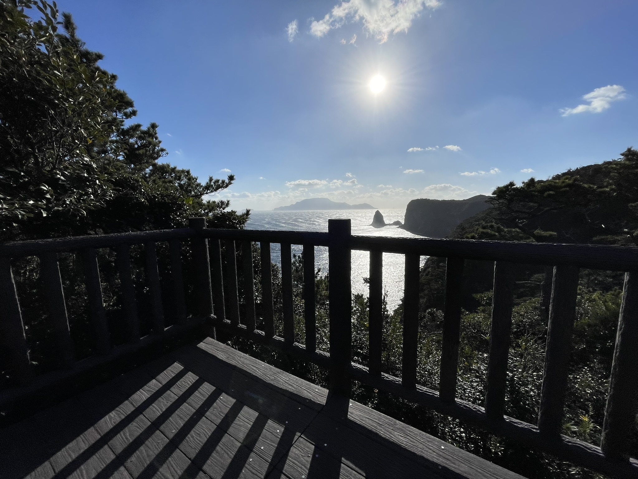 御釜湾(みかまわん)を見下ろす3つの展望台の真ん中にある展望台。神津島のが正面に見える。御釜湾遊歩道入口からは約20分で到着できる。