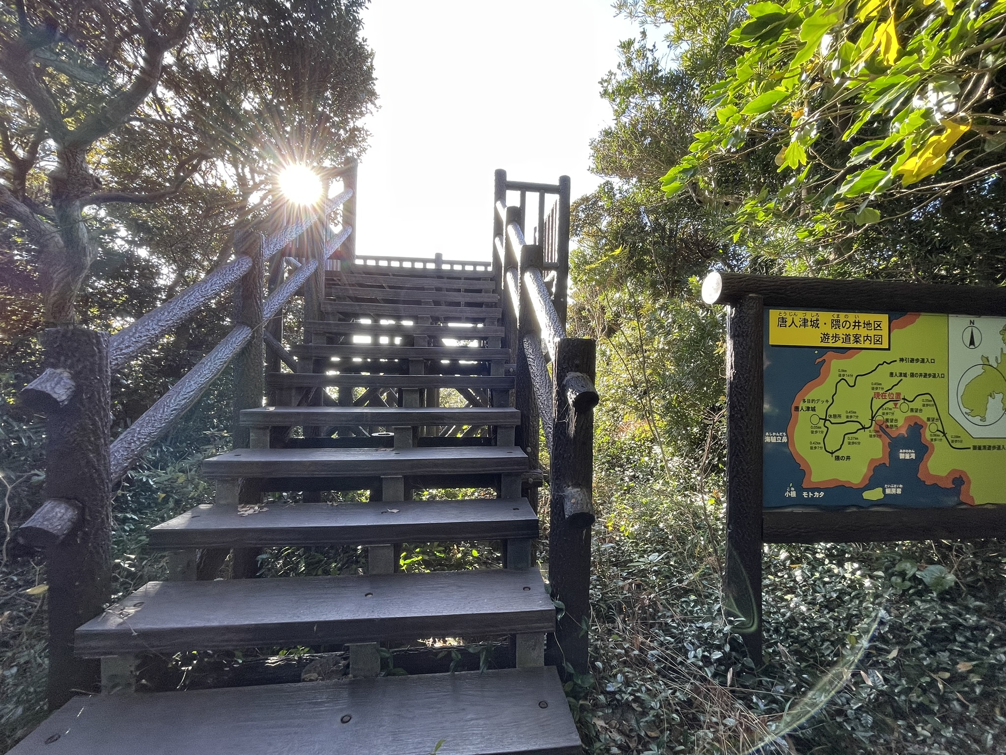 唐人津城同様、古い火口跡の景勝地。隈の井(くまのい)の地名は、雨が降るとすり鉢状の火口跡が水を集め、「幻の池」が出現することから。広々とした砂漠上の大地には、ベンチが点在し、休憩にちょうど良い。崖側は強風が吹き抜け、崩れやすい。柵がないので注意。