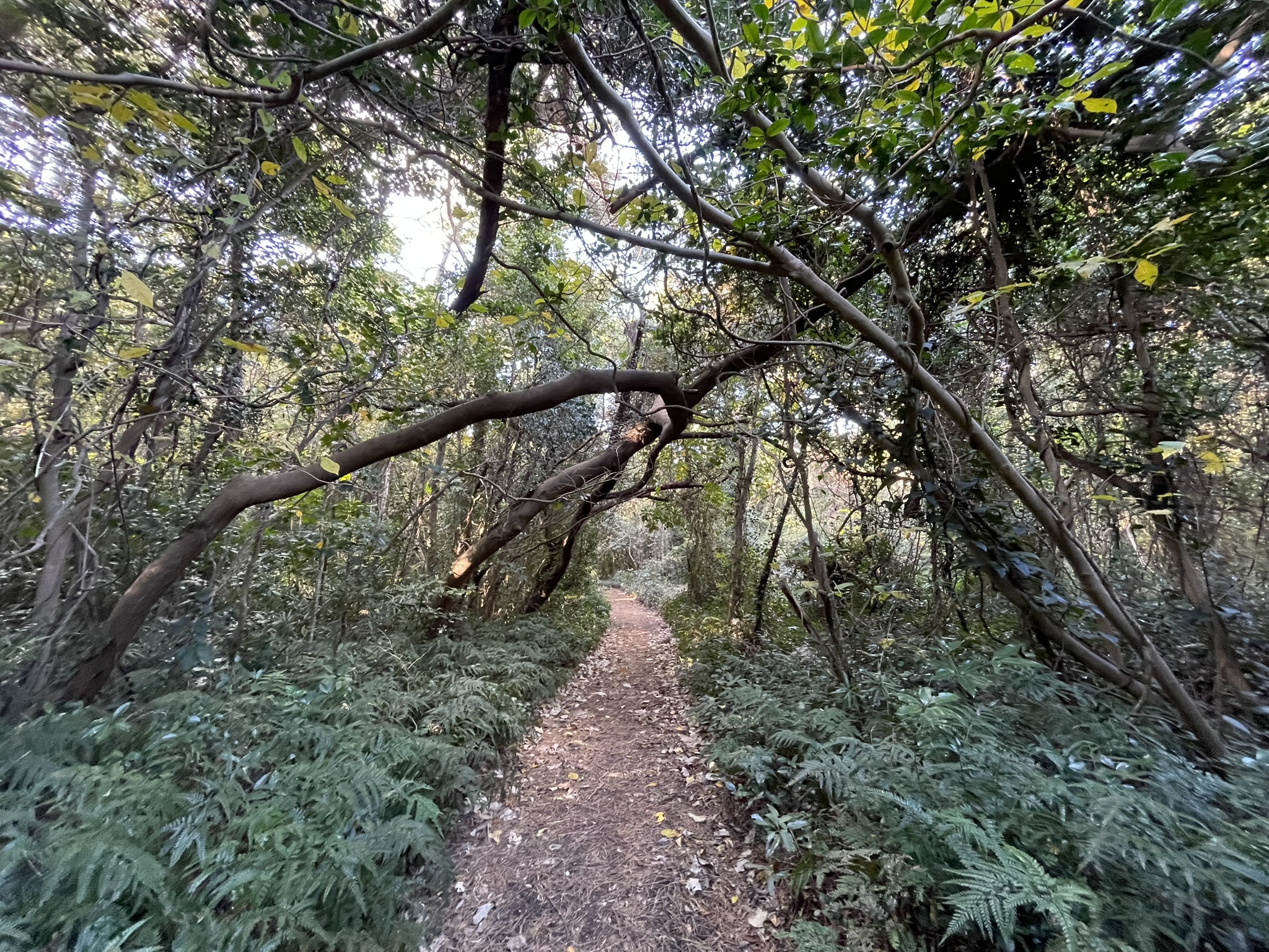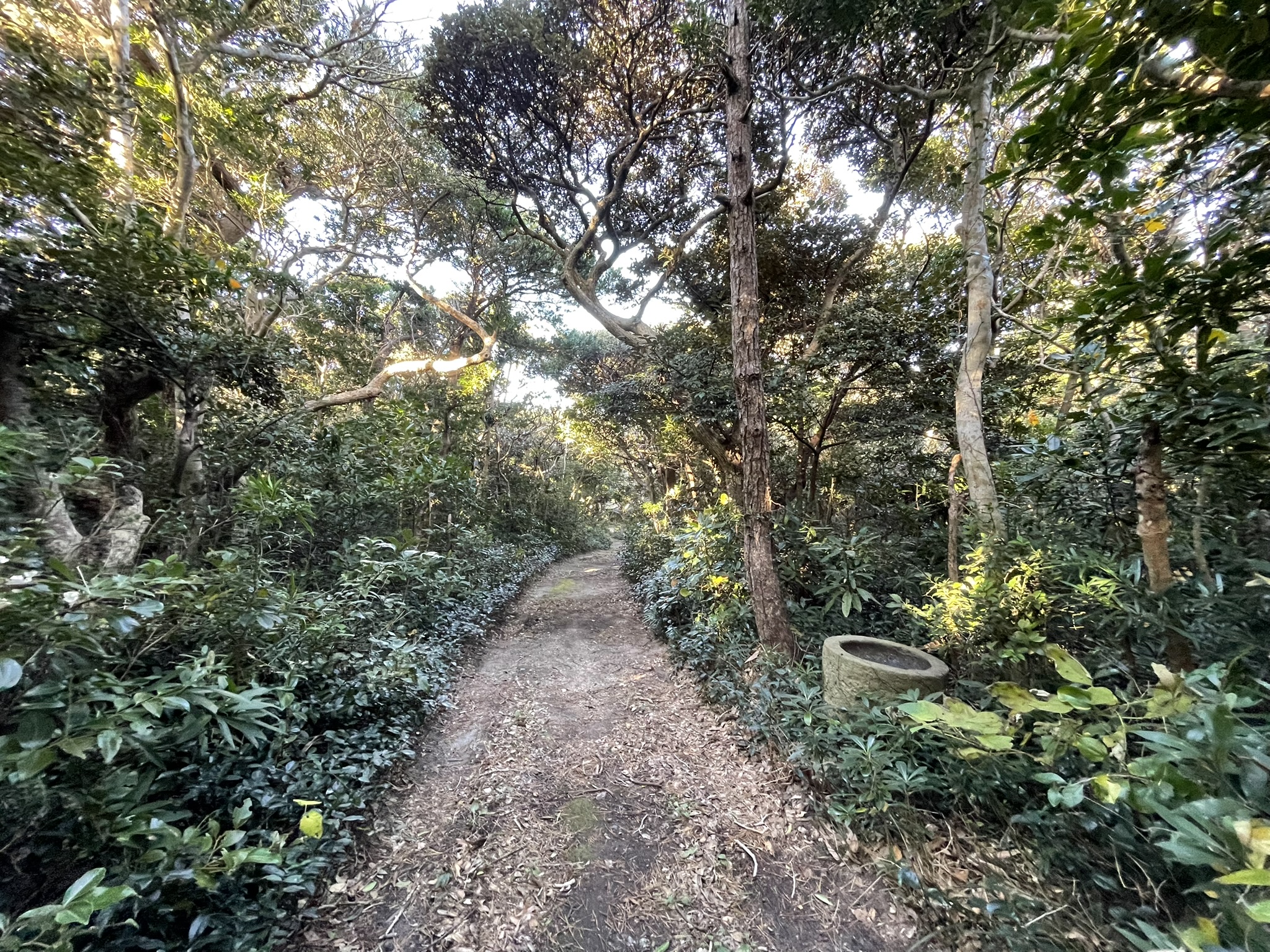 東京都道237号式根島循環線(式根本道)終点付近にある300m足らずの木洩れ日が心地良い小道。バードバスの石臼が、手入れの行き届いた道脇に点在し、野鳥のさえずりが聴こえてくる、おすすめスポット