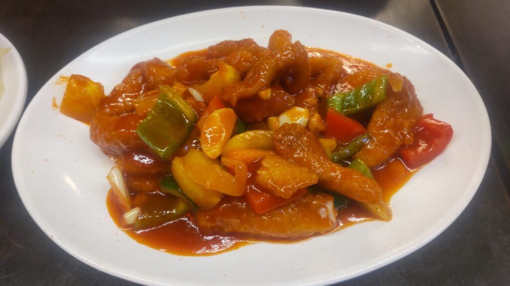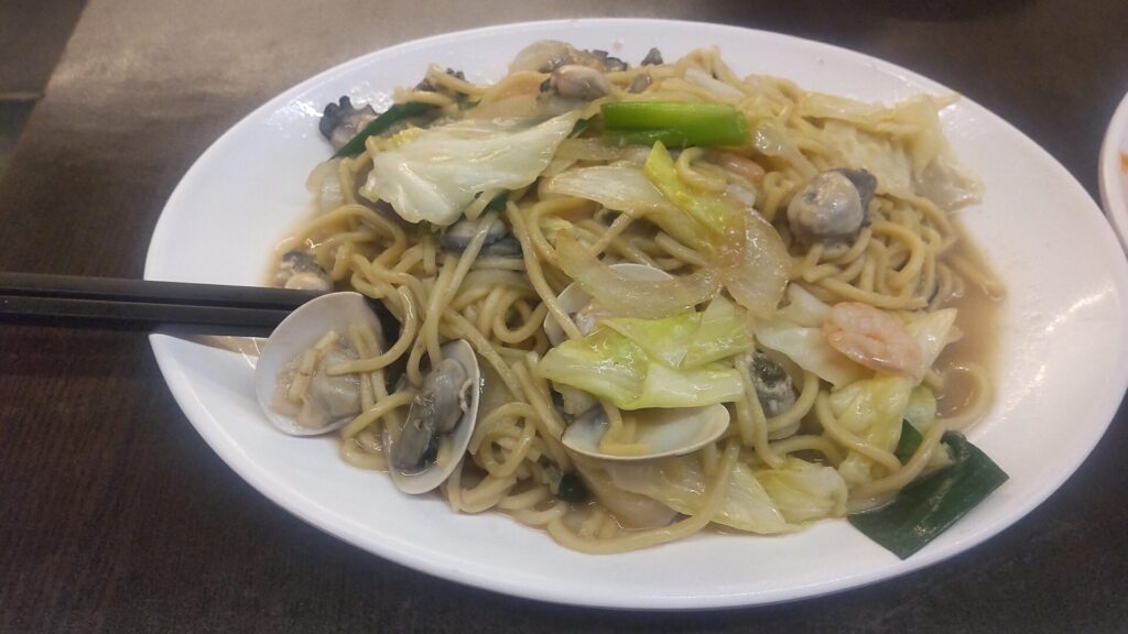 海鮮料理屋で糖醋魚片と海鮮炒麺