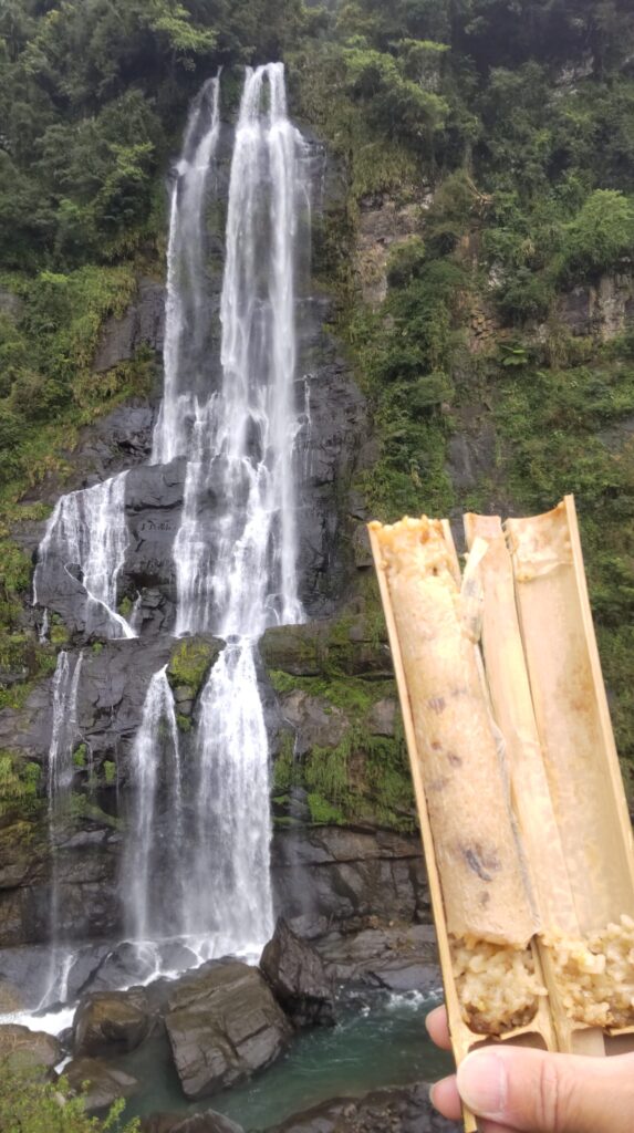 滝を眺めて竹筒飯。