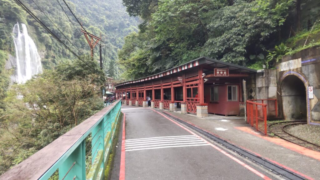 渡ったところに、トロッコの駅がある。