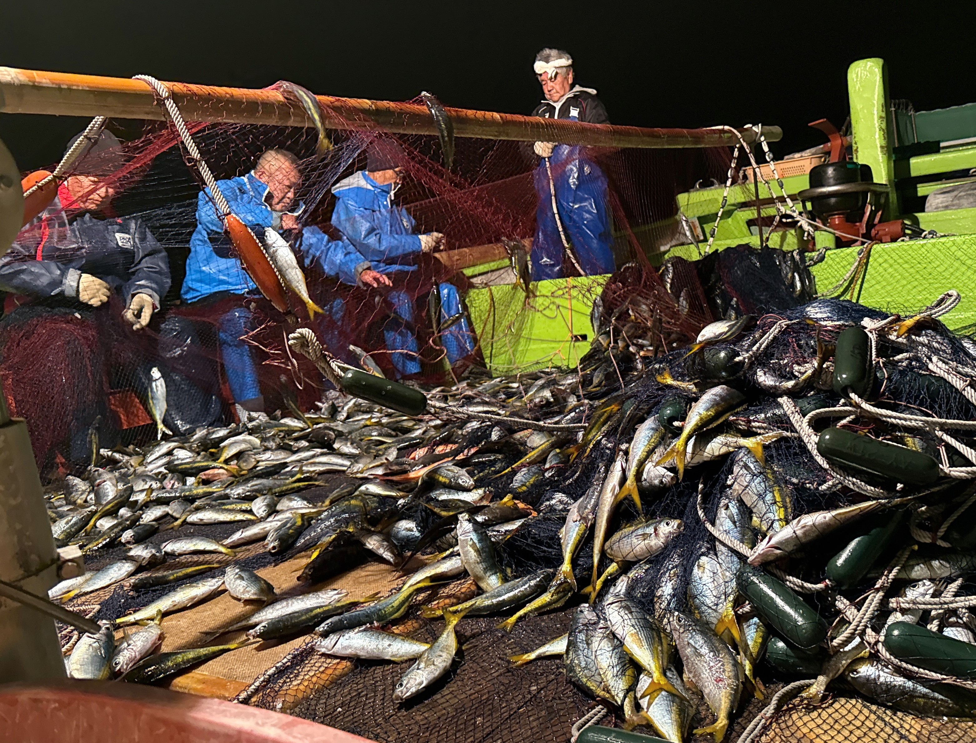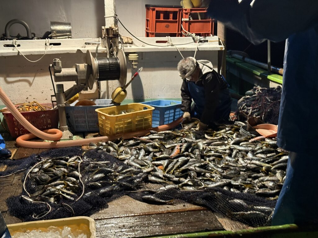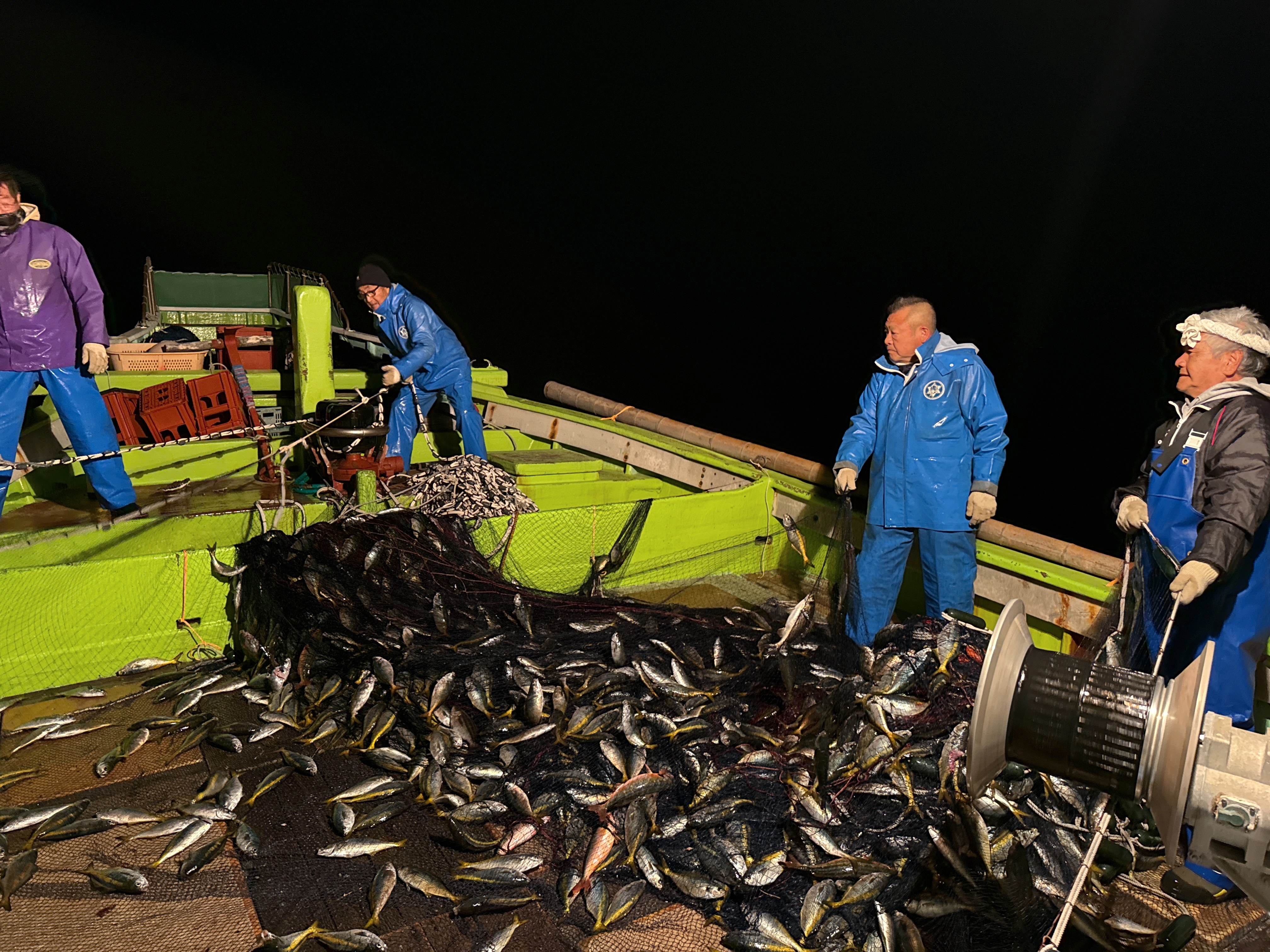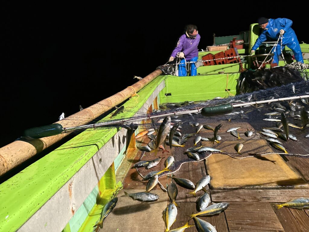 やがて魚群探知機にタカベの群れの反応が見えなくなったタイミングで合図をし、すぐ網を引き上げていきます。