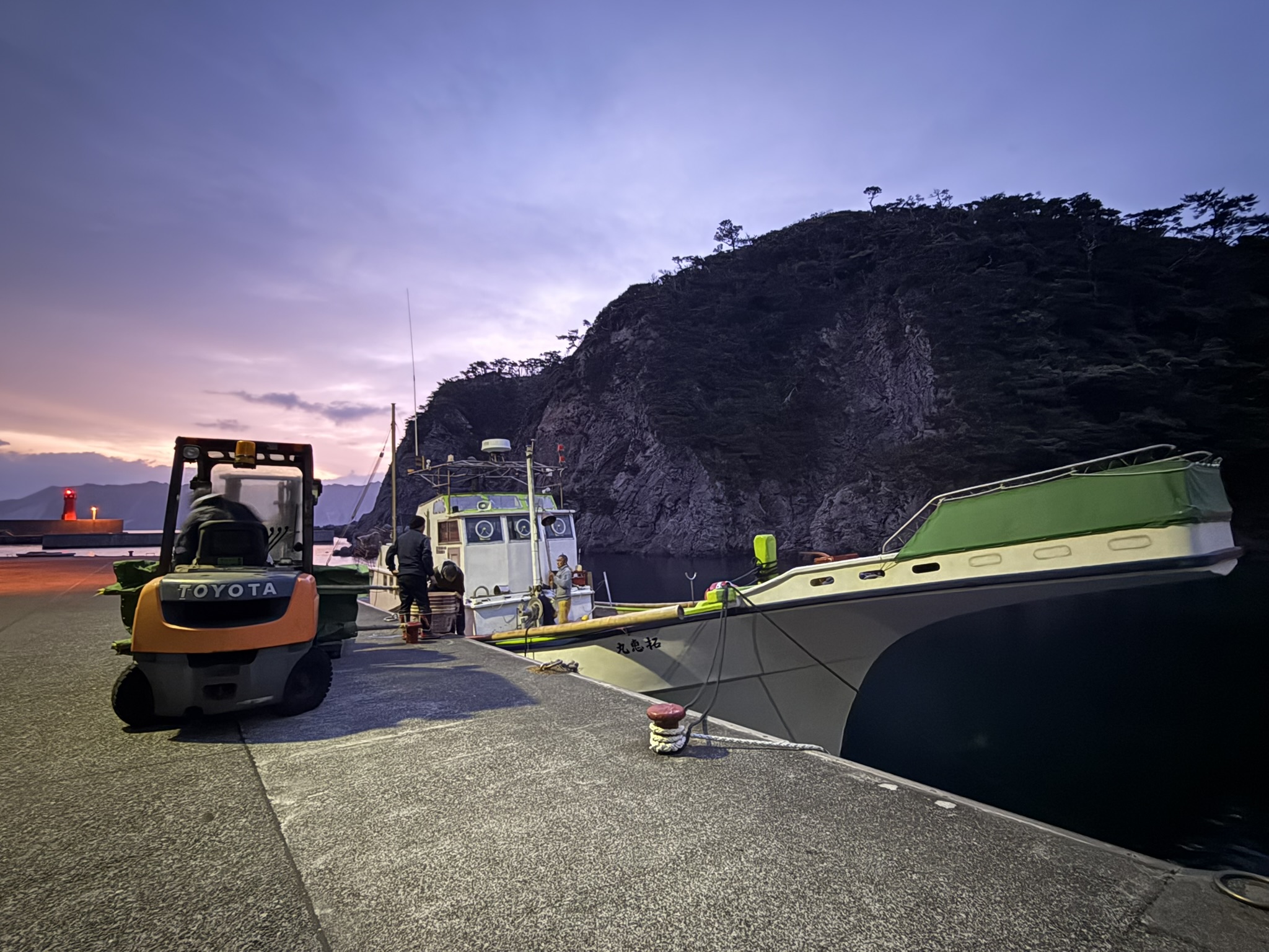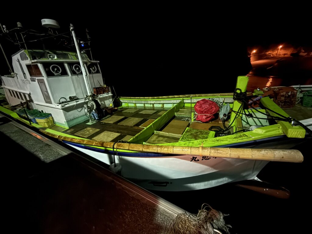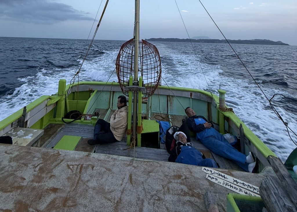 まだ明るいので、完全な闇夜になるまで漁場に近い新島・若郷漁港に船をつけて時間調整します。本日は6人体制です。