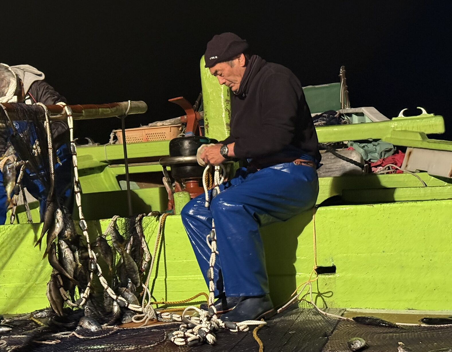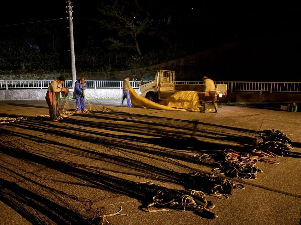 すぐさま、網を整えて、次の漁の準備に取り掛かります。